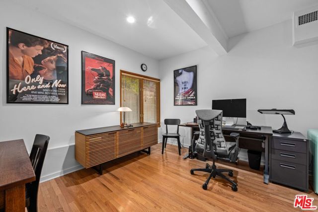 Tucked away South of Ventura Boulevard in the hills above Sherman Oaks, sits a private, gated mid-century style home, blocks from Dixie Canyon Charter Elementary School, St. Francis Elementary, the Buckley School and Harvard-Westlake School. Walk through the front door into the open simplicity of the living room and dining area. On the fireplace wall behind you, beautifully designed bookshelves and cabinets, on the other, windows open to a breathtaking view above the tree tops and across the Valley to the mountains beyond. Have your morning coffee al fresco on the patio, at the dining room table or in the spacious gourmet kitchen. A few steps take you downstairs to the primary bedroom with ensuite bath and walk-in closet. A large family style room for cozy family evenings watching TV or for the kids to call their own, separates the primary from two more bedrooms and full bath. All the rooms open through sliding doors to another patio, an additional spot for entertaining or relaxing as the sun sets over the Valley. The views, fully landscaped hillside and flat lawn area below make this one-of-a-kind property a park-like living experience. It's hard to beat a hillside home that's within easy walking distance to schools, coffee houses, restaurants, bagels, gyms and Pilates studios, and a short drive from Whole Foods, Trader Joes, Gelsons and Ralphs.