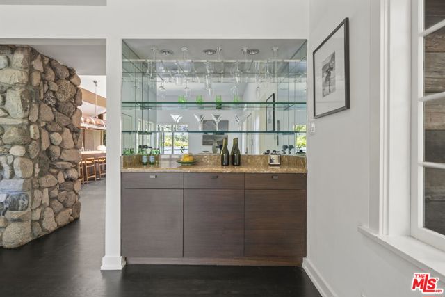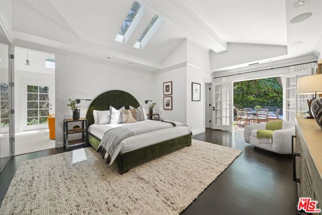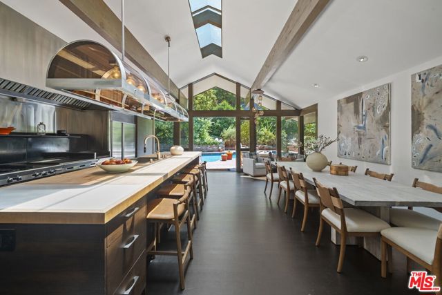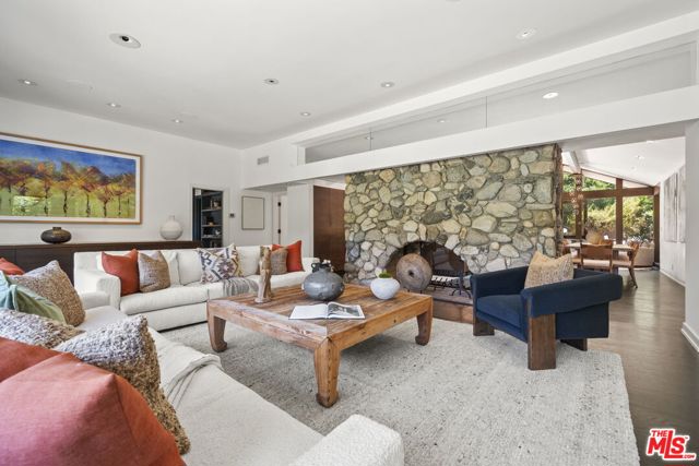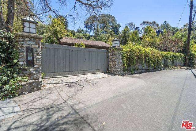 Positively idyllic, this one-of-a-kind Rustic Canyon Santa Monica residence blends historic charm with modern sophistication just moments from Will Rogers beach. Step inside and you're greeted by soaring ceilings, wide-open spaces, and natural light pouring in from skylights and floor-to-ceiling windows. A dramatic double-sided river rock fireplace anchors the semi-open layout, seamlessly connecting the formal living and dining areas. The kitchen is a true standout, featuring a professional-grade six-burner stove, double ovens, a griddle, and a lava rock gas grill, all centered around a large dine-in island with striking custom lighting. The private primary suite serves as a serene sanctuary, tucked away from the other bedrooms, with a newly reimagined spa-like bath showcasing a marble walk-in shower, a freestanding double-sized tub, twin vanities, and multiple skylights bathing the space in natural light. Two additional bedrooms offer peaceful garden views, one opening to the backyard through French doors. A cozy library with its own powder room and an office provide flexibility for work, rest, or retreat. Outside, the lush backyard and sparkling pool are framed by mature fig, avocado and redwood trees, native landscaping and a grassy lawn, creating a truly magical setting. Oozing warmth, soul, and storybook appeal, the home's rustic log exterior - originally sourced from early Hollywood movie sets - pays homage to the neighborhood's rich history as part of the storied "Uplifter's Ranch." The 17sf flat lot offers street-to-street access across from Rustic Canyon Park, complete with tennis courts, a nursery school and a community center for family-friendly activities. Travel further north on Latimer and the neighborhood culminates in a charming cul-de-sac with a bridge and creek. This unique, historic property embodies rustic elegance and relaxed luxury in one of the most enchanting, hidden pockets of Los Angeles. This home is more than a residence, it's a lifestyle.