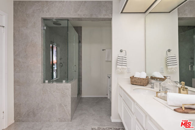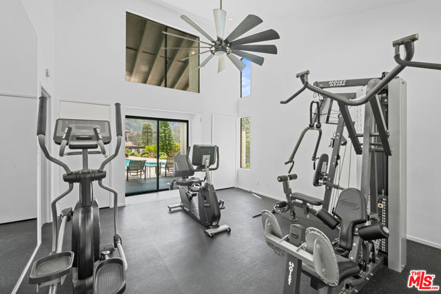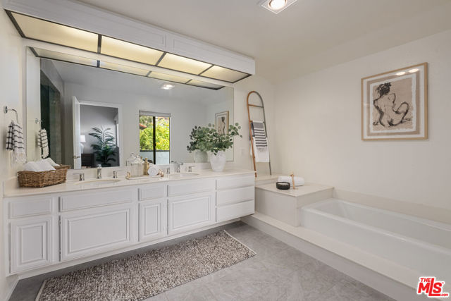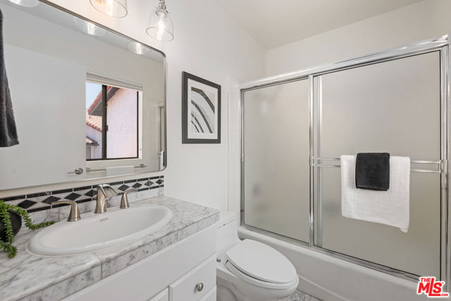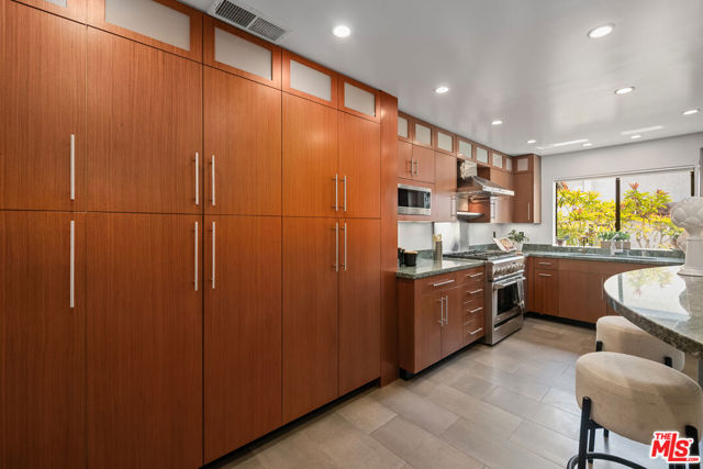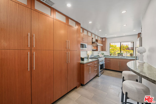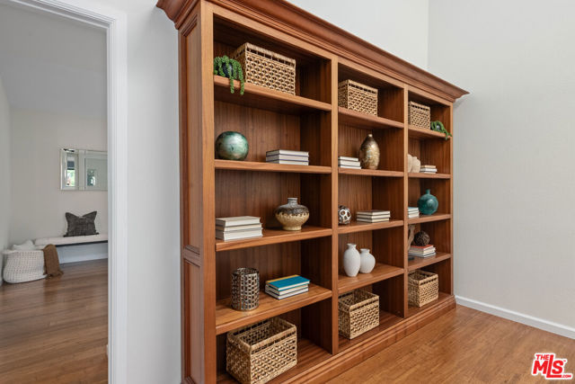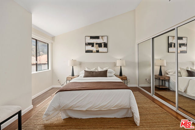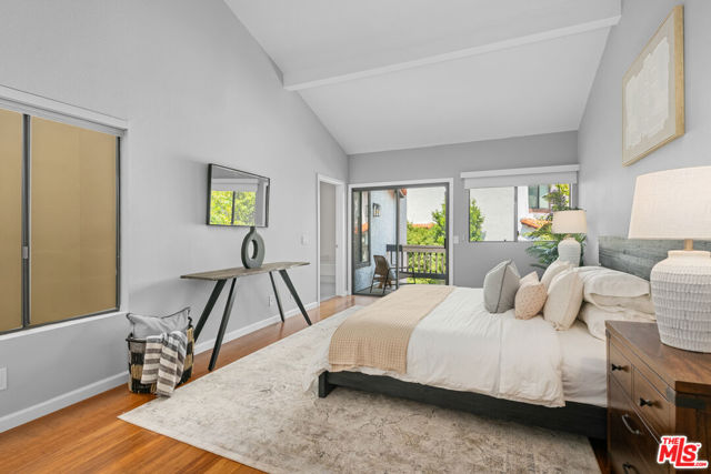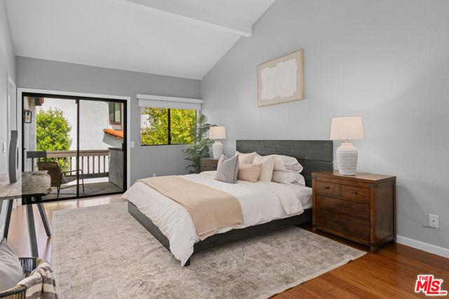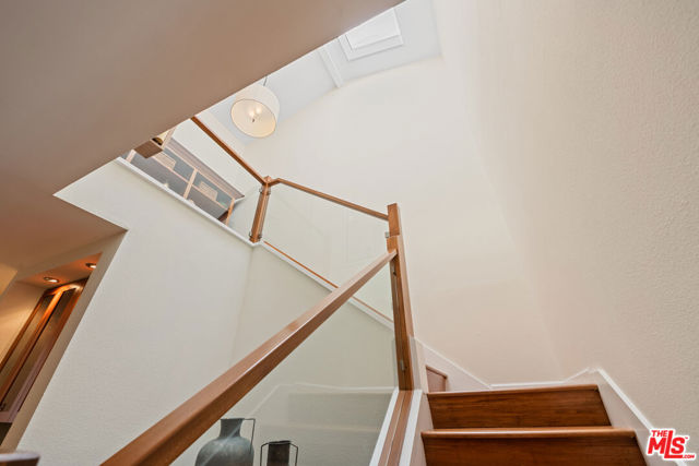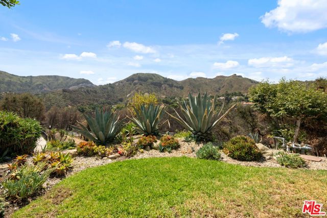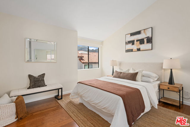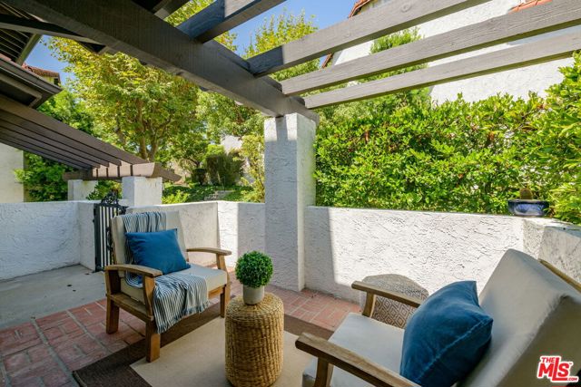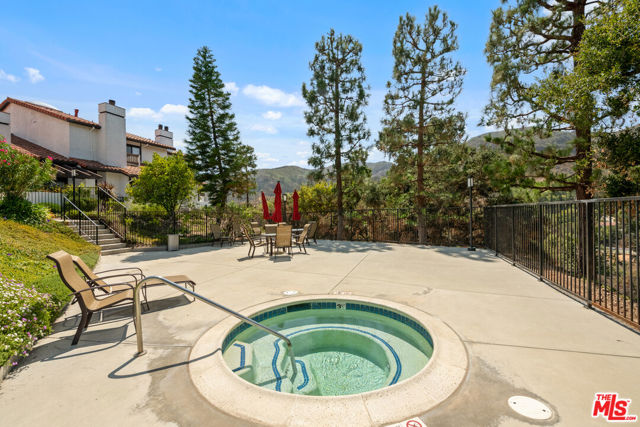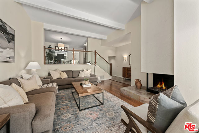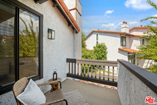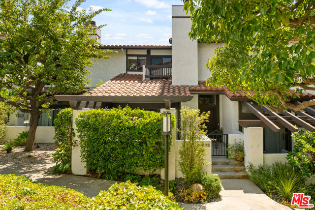 Step into this beautifully designed home featuring an inviting open floor plan that seamlessly integrates the living room with high ceilings, a striking rock stone fireplace, bamboo flooring and an al fresco dining area perfect for entertaining. The spacious dining room boasts elegant glass railings and a stylish bar that leads to a gourmet kitchen, complete with dramatic mood lighting, stainless steel appliances, granite countertops, and custom "pull out" shelving cabinetry. Enjoy the convenience of a built-in microwave, a deep "D" sink, two wine chillers, cozy breakfast bar that are all seated on beautiful ceramic floors. The main level features an exclusive private office or 3rd bedroom that offers complete privacy from upstairs life. A central skylight bathes soft light onto the stunning upstairs mahogany bookcase then gently pours that light down through the glass railed stairwell to the dining area. The luxurious primary bedroom is a true retreat, equipped with a thoughtful designed custom walk-in closet and private balcony that provides relaxing garden greenbelt and mountain views. The master bath features double sinks and large spa tub that offer a serene escape. The second bedroom, also on the upper level, includes an updated bath providing comfort and style. Additional highlights of this freshly painted exceptional home include bamboo wood floors, tankless water heater, epoxy floor in the garage and comprehensive security system. The outdoor space is equally impressive featuring a spacious entertainers patio with privacy hedging perfect for socializing with family and friends. Just up the path is a sparking swimming pool framed by a mountainous landscape featuring a spa, gym, and sauna for ultimate relaxation and recreation. Enjoy the security of a spacious 2 car garage with direct access and adjacent dedicated laundry area with ample cabinet space. There is additional utility in an under the home storage area access door. This residence also provides exclusive entry to a unique private park featuring dog-friendly zones, a playground, and expansive grassy areas, all located just minutes from the beach and picturesque local hiking paths that meander endlessly through the Santa Monica Mountains. Seize the chance to make this beautiful home yours! The fireplace is for decorative purposes only.