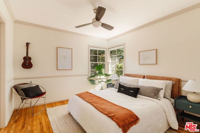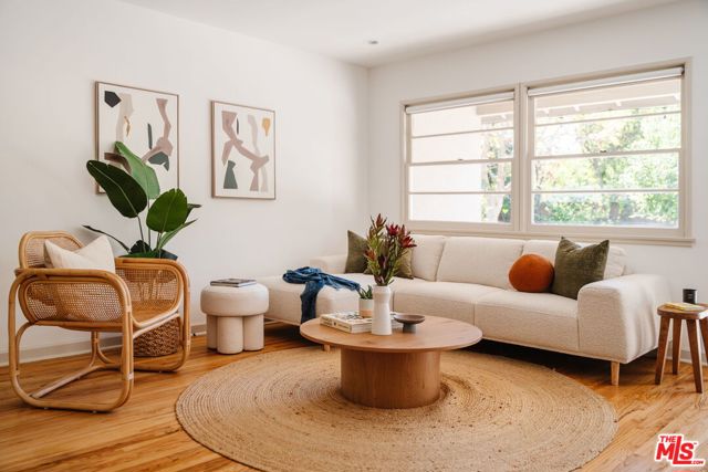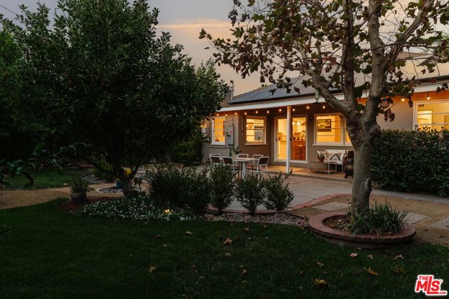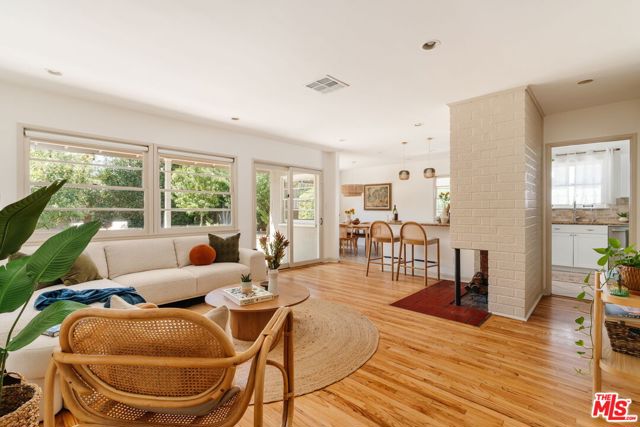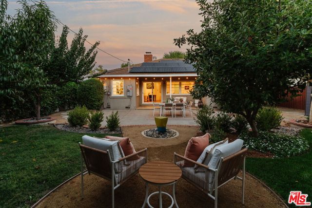 This updated and lovingly cared-for mid-century ranch jewel greets you with its lush, drought-tolerant front yard alive with color, enveloped by a chilean mesquite tree. Step into the open-plan sunny living room with wood-burning fireplace as stunning refinished original oak hardwood floors flow throughout. Updates & energy savings: FULLY PAID OFF SOLAR, newer HVAC, newer roof and garage door, Level 2 EV fast charger, copper plumbing, attic insulation, nest thermostat, water filter, and an upgraded 200-amp panel to mention a few. The remodeled kitchen features stone counters, updated cabinetry with organizer pullouts, newer Samsung and KitchenAid appliances, dining area, and separate breakfast bar that opens to the living room, perfect for morning coffee or lively evenings. The floor to ceiling pantry and laundry room are located just off the kitchen, replete with storage. A thoughtful floor plan offers one bedroom up front with en suite bath, and two more tucked down their own private wing with even more hall and closet storage. The baths have been updated, including the full bath with dual-sink vanity and gold Rejuvenation finishes. The landscaped backyard hosts a sanctuary of fruit trees gathered around a flowing fountain in your own private garden of eden. Room to host summer BBQs under the twinkle lights and still plenty of space for a pool or spa in your high-walled landscaped large lot, with a chic storage shed to store all your gardening needs. The finished 2-car garage offers flexibility of use for parking, a home gym, or home office. All just minutes from great grocery stores, shops, dining, and theaters at Northridge or Westfield Topanga & The Village (hello Costco!), yet tucked away in the serenity of its cozy Sunnybrae neighborhood. Welcome home!