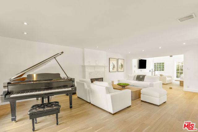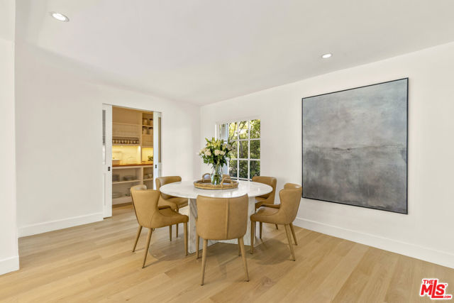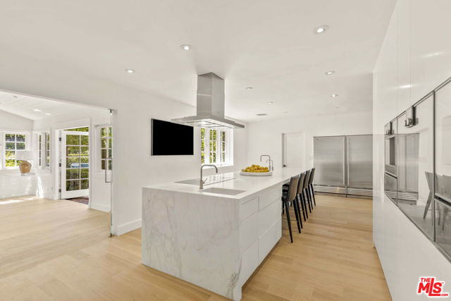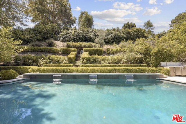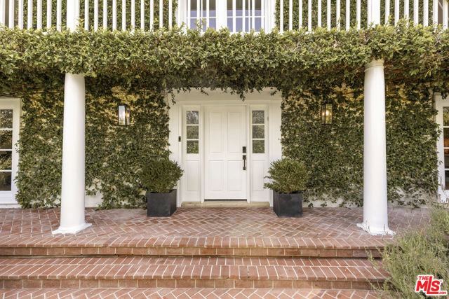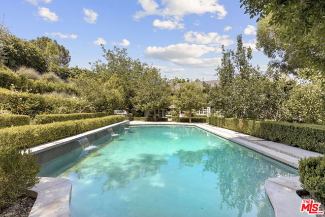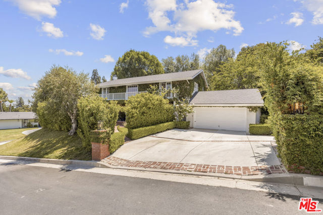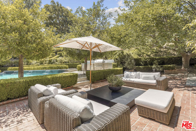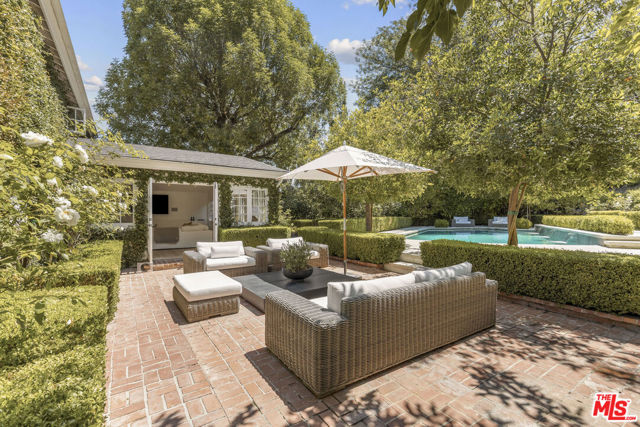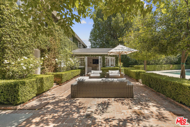Framed by climbing ivy, white columns and a brick path, 5020 Bilmoor Avenue is a character-rich Country English Traditional set on over half an acre corner lot South of the Boulevard. Step inside to bright, gallery-white interiors and newly refinished wide-plank hardwood floors that set a calming, modern tone. A formal living room centers on a marble fireplace, while the expansive family room unfolds beneath a vaulted, tongue-and-groove ceiling with French doors on both sides for effortless indoor-outdoor flow. The custom chef's kitchen pairs a custom Regina honed marble countertop with a double-wide Sub-Zero refrigerator/freezer and Gaggenau appliances. The kitchen flows to the dining area, walk in pantry and downstairs powder + laundry room.Upstairs, the primary suite features treetop outlooks and a romantic balcony, and a spa like bath with marble floors, a freestanding soaking tub, and classic wainscoting. Three additional bedrooms and a full bathroom complete the top floor. A show stopping backyard features an oversized pool with trio water features, manicured parterre hedges, terraced flowering beds, and a fruit orchard to create a private, estate-like setting. Entertain on brick patios beside an outdoor kitchen with Viking appliances, or lounge by the pool. The detached garage has been transformed into a professional-grade music studio complete with an iso-booth - an inspiring creative haven with a storied legacy of legendary artists. 5020 Bilmoor Ave combines a rare blend of charm, privacy and luxury in one of Tarzana's most sought-after pockets.