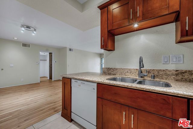 Elegant, courtyard-facing 2 Bedroom, 2 Bath condo at the Villas del Rey. This is an interior unit with just one connection wall to neighbor. It features sliding door access to 300+sf of patio area from the living room and both bedrooms. The kitchen has granite counters and custom cabinetry. Both bedrooms have large walk-in closets. The primary bedroom is ensuite and has its own separate, enclosed patio area. Other highlights include central heat/air, full-sized washer & dryer, plantation shutters (in living room), and stylish Pergo flooring throughout. It's location near a pedestrian exit off of the main courtyard provides convenient access to sidewalk on Manchester Ave for walking your dog or visiting the nearby shopping center. Complex amenities include community pool and spas, tennis courts, gym, saunas, clubhouse, guest parking, and extra storage. Villas del Rey is located approximately a mile from downtown Playa del Rey and beach, and just minutes from nearby Playa Vista, Marina del Rey, freeway connections, and LAX.