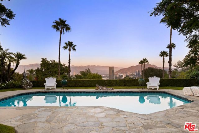 Tucked away on a rare, flat 11,000 SF lot in the Hollywood Hills, this expansive mid-century ranch radiates joy and calm in equal measure. The moment you pass through the privacy hedges and step inside the cheerful orange front door, the home's warm energy is unmistakable. At the heart of the home, a generous great room is anchored by a classic brick fireplace on one side, custom built-ins on the other, and sliding glass doors in the center that frame sweeping views of the hills, mountains, and Universal City. Just beyond, the large flat backyard with sparkling pool becomes a natural extension of the living space, inviting seamless indoor-outdoor living. The sunlit kitchen is equally inspiring, with crisp white cabinetry, Caesarstone counters, and a built-in banquette framed by bay windows that perfectly capture the view. A spacious laundry room and full bath sit conveniently adjacent. On the opposite wing, a large den with French doors opening to the backyard leads to three bedrooms, including two that share a Jack-and-Jill bath and the primary suite. The primary retreat is a sanctuary unto itself, with a custom walk-in closet, ensuite bath with dual sinks, soaking tub, and separate shower, plus French doors that open directly to the pool and garden. Above the converted garage discover a flexible fourth bedroom, once a recording studio, ideal as a creative workspace, private guest suite, or the perfect hideaway for a teenager in need of their own world. The backyard is nothing short of show-stopping: lush landscaping, a stone-flanked pool, and generous flat grassy areas offer endless opportunities to lounge, play, and entertain, all with dazzling views as your backdrop. With its rare combination of a thoughtful floor plan, expansive flat lot, serene views, and a central location, this home offers not just a place to live, but a place to truly exhale.