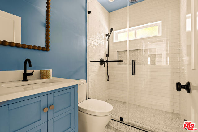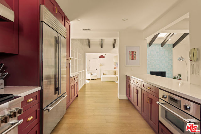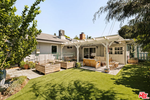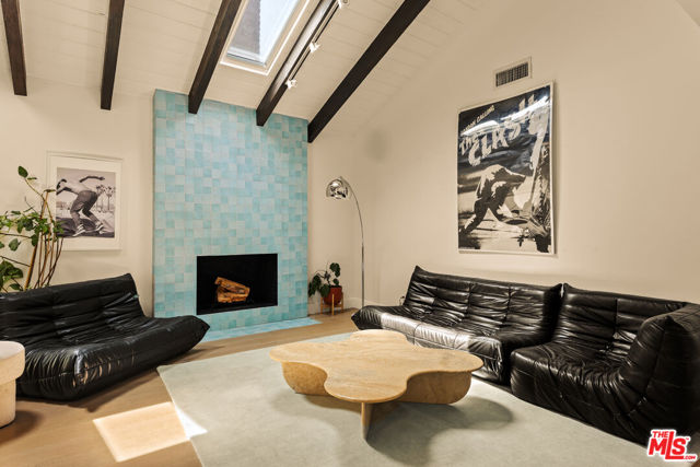 Set behind a gated entry, 4841 Don Pio Dr is a curated Woodland Hills residence that blends privacy, natural light, and refined design. This three-bedroom, two-bath home, plus a converted garage ideal for a studio, gym, or office, offers open-concept living enhanced by exposed beams, skylights, and thoughtful details throughout. A striking teal-tiled fireplace anchors the main living area, while the newly renovated kitchen features custom cabinetry, designer tile work, and stainless steel appliances. The spacious primary suite includes an en-suite bathroom, while two additional bedrooms offer flexibility. A secondary living room with double exposure open to a serene outdoor setting with a covered patio, turfed lawn, sauna, citrus trees, and lush garden beds. The property is equipped with solar panels, offering both sustainability and efficiency, and is securely gated with EV charging station. Ideally located near Ventura Blvd and The Commons at Calabasas, this gated home captures the essence of elevated California living with timeless style and comfort.