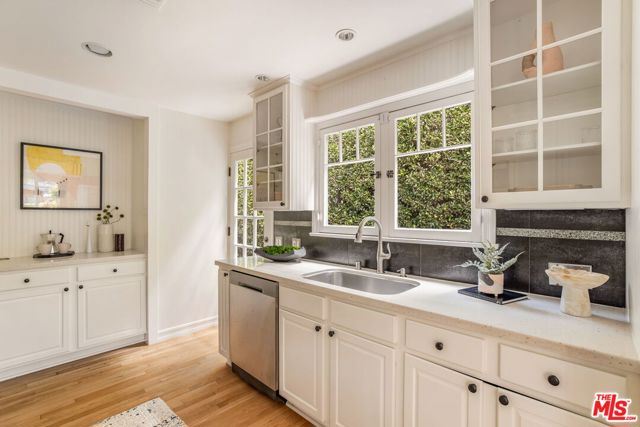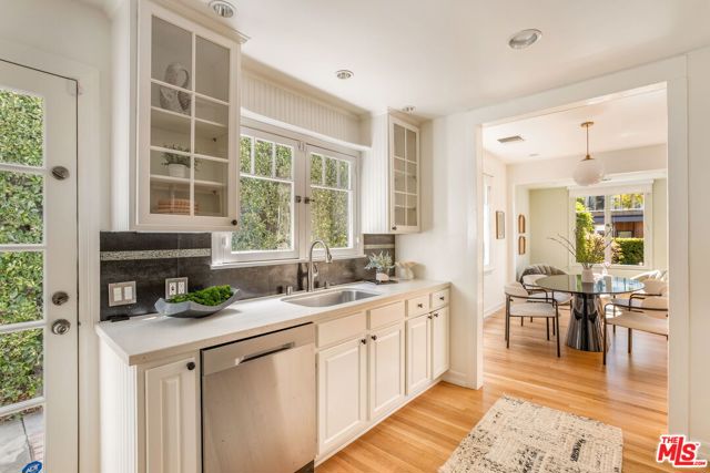Private Cape Cod retreat located in the heart of prime West Hollywood West. Hidden behind hedges and an arched gate, lies a secret garden with roses and usable front yard. Main house features 2 BR+ office+ loft and 2 BA. Sun filled living room features a fireplace with South facing French doors leading out to a front patio. Dining room with cozy reading nook, leads to the kitchen with stainless steel appliances and updated counter tops. Hardwood floors throughout. The primary retreat includes a separate office/den with a two-story loft. En-suite bathroom with Carrera marble tile and walk-in closet. Back garden with sitting area leads to a permitted detached studio above the garage with its own full kitchen, bathroom and separate laundry. Unique opportunity to acquire this property with adjacent property (8917 Dorrington Ave). Would make a wonderful place to call home.