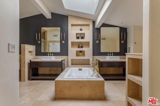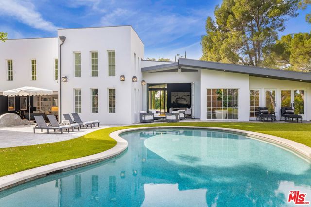 Perched on a quiet street just above the Flats, this architecturally interesting mid-century modern residence blends warmth, openness, and scale; moments from the heart of Beverly Hills. Strong architectural lines, beamed ceilings, and light-filled interiors create an inviting sense of volume throughout. A dramatic pivot entry opens to expansive living spaces anchored by a stone fireplace and designed for effortless indoor-outdoor living. The kitchen centers around a 12-foot island with dual Wolf induction ranges, Sub-Zero refrigeration, and book-matched statuary marble, complemented by a marble wet bar and adjoining den for more intimate gathering. Upstairs, the skylit primary suite offers a private balcony, fireplace, dual walk-in closets, and a spa-like bath. Additional guest suites continue the home's cohesive design. Designed for entertaining, the outdoor areas include a Pebble-finish pool, built-in barbecue, generous lawn, and multiple areas for dining and lounging. A refined mid-century modern in one of Beverly Hills' most coveted enclaves.