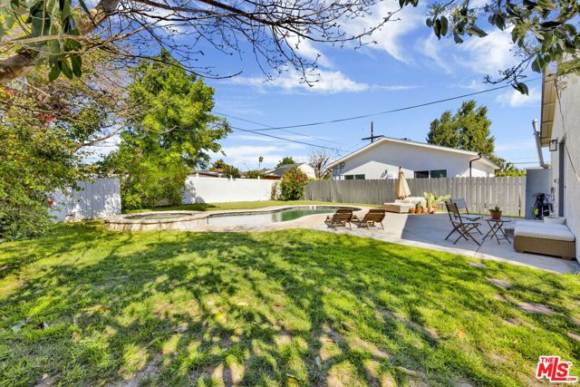 Welcome to this charming gated 3-bedroom, 2-bath home offering nearly 1,300 sq ft of comfortable living space, tucked away in a desirable pocket of Van Nuys. Bright and inviting open floor plan where the living room flows seamlessly into the dining area and kitchen, creating an ideal space for both everyday living and entertaining. The living room features recessed lighting and a large dual-pane window that fills the space with natural light. The updated kitchen features granite countertops, stainless steel appliances, a dishwasher, a microwave, and abundant cabinetry for storage. Two well-appointed guest bedrooms are served by a full hallway bathroom, while the spacious primary suite provides a relaxing retreat with recessed lighting, a walk-in closet, and an en-suite bathroom featuring a large dual-sink vanity. Step outside through the primary bedroom and discover a private backyard oasis perfect for entertaining or unwinding. Enjoy a heated pool and spa ideal for warm California summers, along with a lush avocado tree and patio space designed for outdoor dining and gatherings. Additional highlights include hardwood flooring throughout, New Exterior paint, Newer central A/C and heat, a newer roof, and a one-car garage with laundry and direct home access. Generous 6,100 sq ft lot. This home offers convenient access to the 405 freeway, shopping, and a variety of local dining options, making it a wonderful blend of comfort, privacy, and accessibility.
