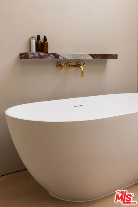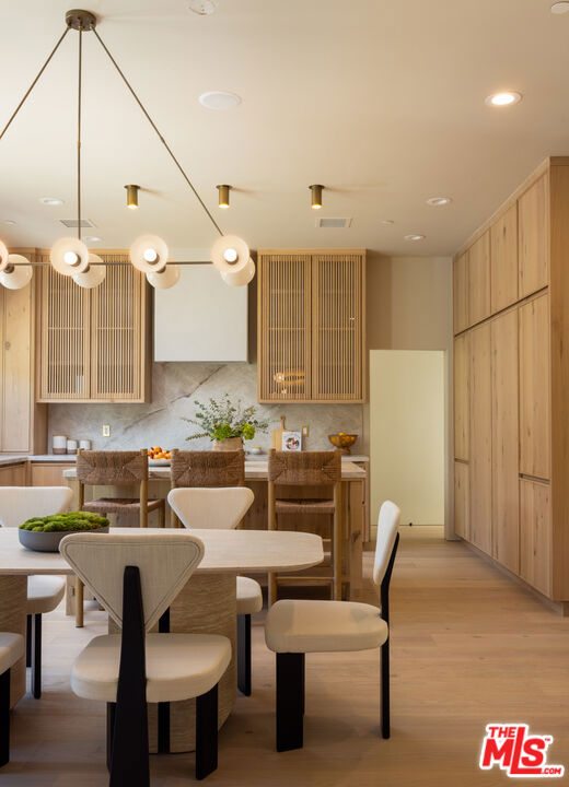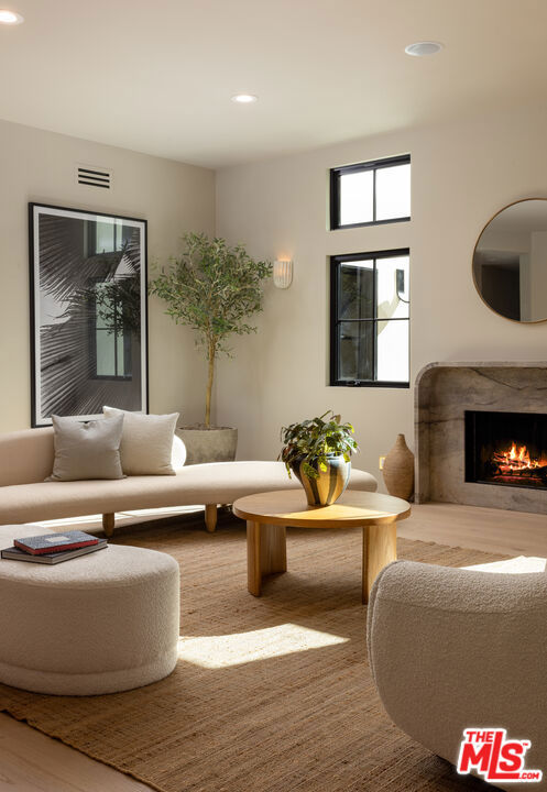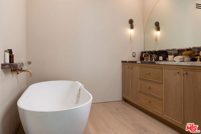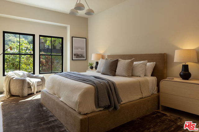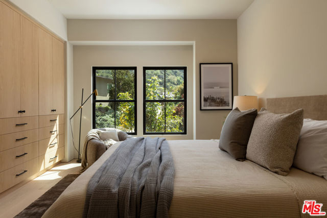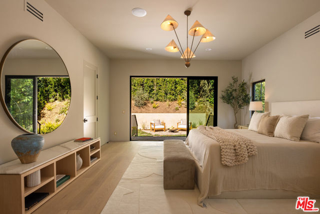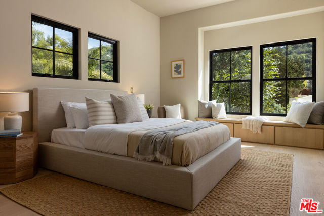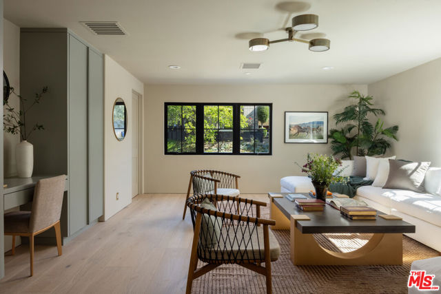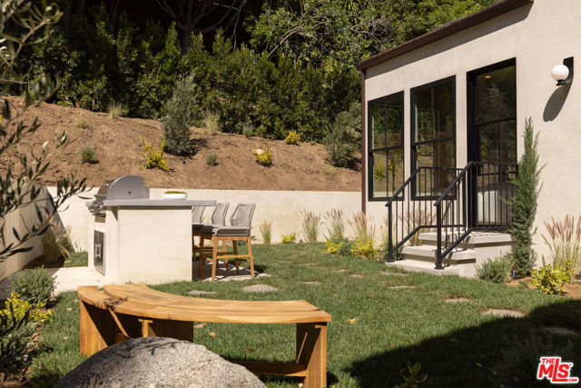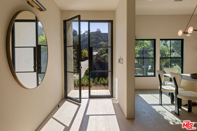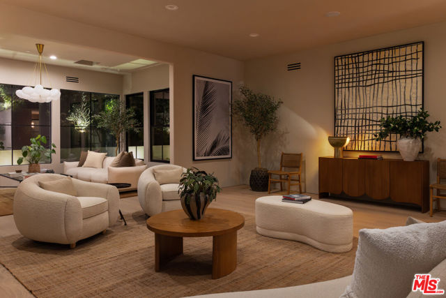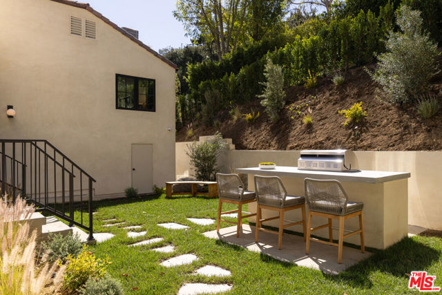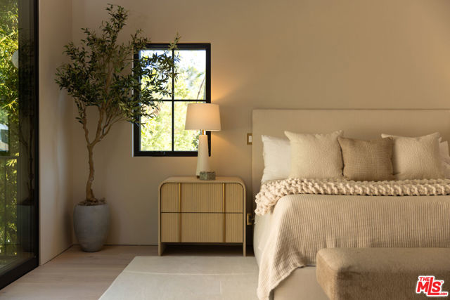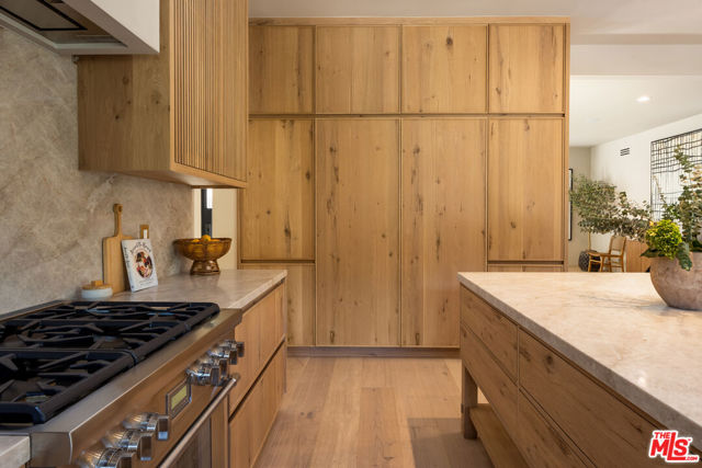 Designed by Abode Homes, this fully reimagined residence in the coveted Longridge Estates represents a refined approach to architecture, craftsmanship, and livable design. Known for creating thoughtfully detailed homes throughout the area, Abode brings a careful balance of proportion, natural materials, and modern functionality to each project. Silver travertine pavers lead to custom Pinky's iron entry doors, revealing light-filled interiors defined by soaring 10-foot ceilings and a marble fireplace that anchors the main living space. Newly installed windows and doors invite natural light throughout while creating a seamless connection to the surrounding landscape.At the center of the home, the kitchen is designed for both everyday living and effortless entertaining. Leathered Taj Mahal quartzite countertops pair beautifully with custom rustic white oak cabinetry, offering generous workspace and storage. Custom white oak millwork carries throughout the home, bringing warmth, texture, and continuity to the interiors. The primary suite serves as a peaceful retreat tucked among mature trees, featuring tailored millwork and a spa-inspired bath finished with Viola marble, handcrafted zellige tile, and unlacquered brass fixtures. The powder room showcases Roman clay plaster walls, an integrated travertine basin, and Waterworks fixtures. Modern comfort is seamlessly integrated throughout the home with smart home features including a security system, surveillance cameras, and a fully integrated indoor-outdoor speaker sound system. Designed with longevity in mind, the home also incorporates fire-resistant elements including a new tile roof and smooth stucco exterior. Major improvements include all new windows and doors, new flooring, updated HVAC systems, copper plumbing, upgraded electrical, and thoughtfully designed drought-tolerant landscaping. The outdoor BBQ and dining area extend the living spaces outdoors, creating a relaxed setting for quintessential California entertaining. Set on a quiet street just moments from the restaurants, shopping, and fitness destinations along Ventura Boulevard including Erewhon Market and the Sportsmen's Lodge. Longridge Estates remains one of Sherman Oaks' most desirable neighborhoods, long favored by notable figures in entertainment and the arts.