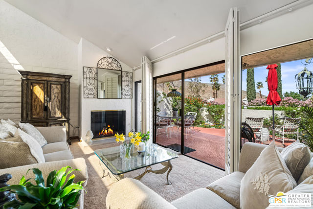DESIGNED BY RENOWNED ARCHITECT HUGH KAPTUR, a visionary of mid-century modern design, this 3-bedroom, 2-bath condo is located in the architecturally significant KINGS POINT community. Soaring CATHEDRAL CEILINGS, CLERESTORY WINDOWS, and a cozy fireplace in the living room highlight the timeless appeal of desert modernism. Three distinct patios offer a seamless indoor-outdoor lifestyle. The largest, with BREATHTAKING MOUNTAIN VIEWS, opens from both the living room and one of the guest bedrooms ideal for entertaining or quiet relaxation. A completely private patio connects to the dining area and primary suite, creating a peaceful retreat with direct access to the TWO-CAR GARAGE. A third, smaller patio offers a quiet space for morning coffee or evening unwinding. The sizable kitchen provides generous counter space and storage, perfect for anyone who enjoys cooking or hosting. In the primary suite, you'll find a spacious walk-in closet and an en-suite bath. Two additional bedrooms and a second full bath offer comfortable accommodations for guests or family. Out front, a welcoming courtyard with desert landscaping enhances curb appeal while remaining low-maintenance. KINGS POINT residents enjoy RESORT-STYLE AMENITIES, including sparkling POOLS, TENNIS COURTS, and expansive GREENBELTS all set against a dramatic mountain backdrop. A rare opportunity to own within one of Palm Desert's most iconic architectural communities.