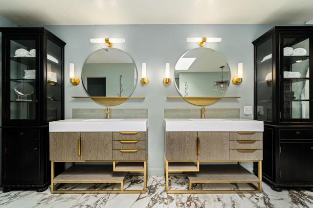 Welcome to a home where modern elegance meets timeless glamour in perfect harmony, located in the popular Springs Country Club in the heart of Rancho Mirage. This exquisite 3-bedroom, 3-bath residence features 3,088 square feet of living pace and is full of style, blending Hollywood Regency style with the natural beauty of the Desert. Completely updated, this stunning home is a show stopper.As you step through the dramatic entryway, you're greeted by a spacious, open-concept living area. The living room is adorned with soothing, muted tones that create an expansive and inviting atmosphere. Recessed lighting and sleek pendant fixtures provide warmth and illumination, enhancing the room's welcoming ambiance. The bar's sleek countertops and high-gloss finishes are perfect for entertaining guests and accent walls add a dramatic flare.Seamlessly integrated, the living area flows into the stylish kitchen and dining area. This chef's paradise boasts striking Brazilian stone surfaces, a high-end Italian gas cooktop, custom cabinetry, and a 160 bottle wine refrigerator--perfect for everyday culinary adventures or hosting guests in style.The grandeur extends into the formal dining room, setting the stage for unforgettable dinner parties under statement lighting and surrounded by luxurious finishes.Retreat to the dramatic primary suite, a sanctuary of relaxation with its spa-inspired bath complete with a steam shower, ample closet space, and direct access to the private outdoor pool area. Two additional guest bedrooms offer flexibility and comfort, each with their own bathrooms and private patio spaces.Step outside to your private pool, glistening under the desert sun and surrounded by meticulously manicured landscaping and inviting lounging and dining areas. Even your car will be pampered with an Split AC in the spacious garage!This home doesn't just offer residence; it delivers a lifestyle rich in glamour, sophistication, and serenity. Whether for intimate soirees or tranquil escapes, experience luxury living at its finest where every detail is designed with elegance and ease. Residents of the Springs Country Club enjoy access to world-class amenities, including an 18 hole golf course, tennis, bocce and pickleball courts, a state of the art fitness center, and a gorgeous clubhouse and grill offering multiple dining options.