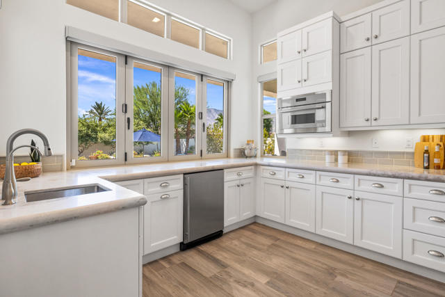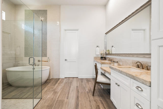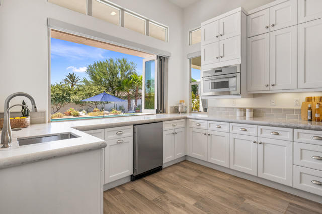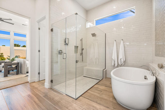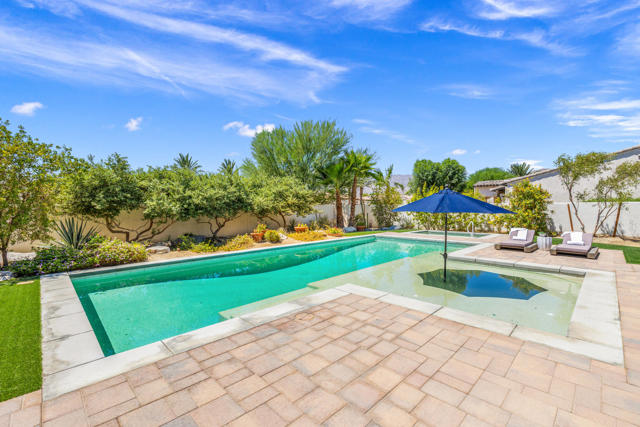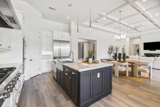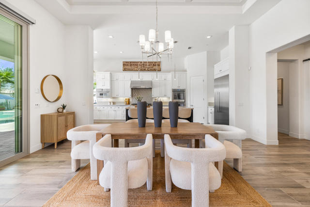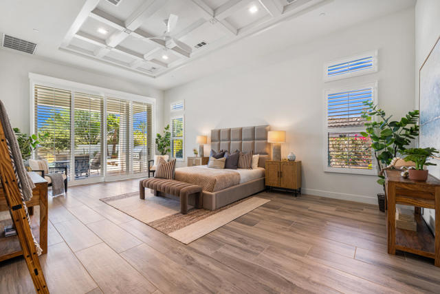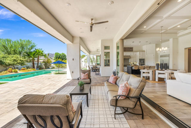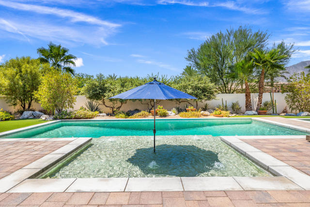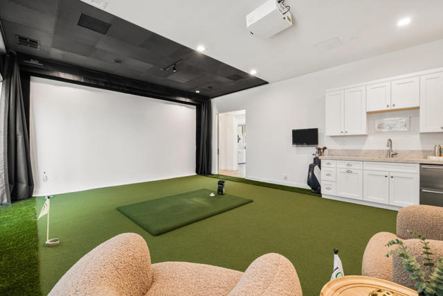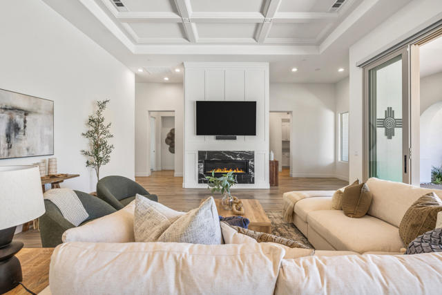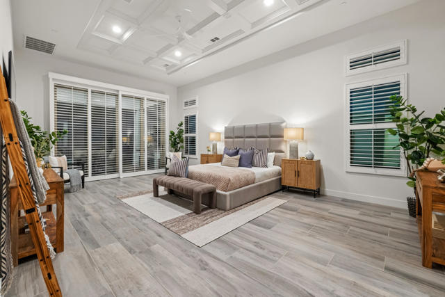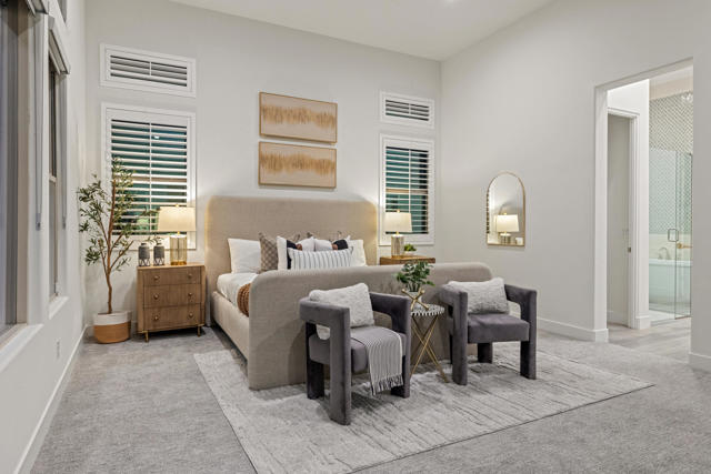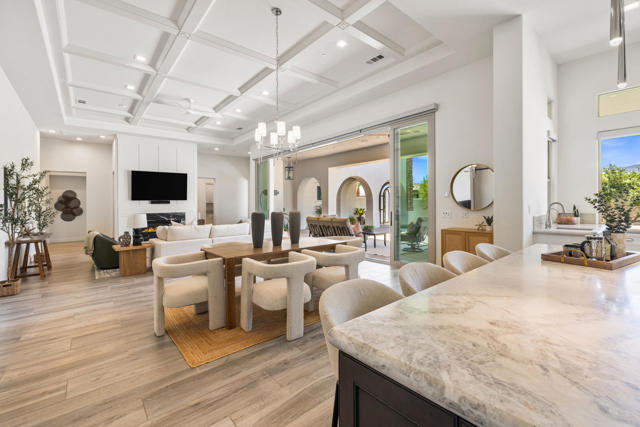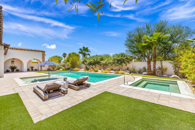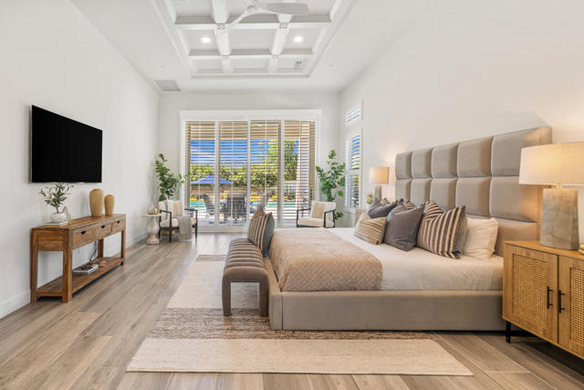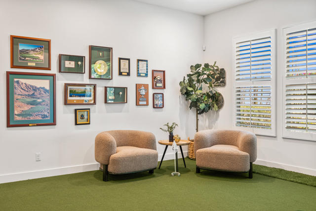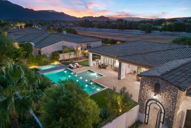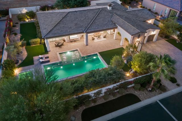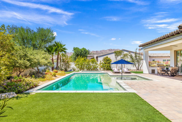 Griffin Ranch l La QuintaDiscover Ultimate Desert Living in La Quinta's most sought-after Residential Community. This expansive 4,154' residence, situated on a generous, almost 21,000' homesite, features 4 bedrooms - including 2 stately primary suites - plus an additional bonus room dedicated as a state-of-the-art golf simulator for true golf enthusiasts. The open floor plan is lite and roomy, evoking a casual, zen-like feel, ideal for relaxation. The calm and comfortable ambiance showcases tall, elegant, coffered-ceilings with decorative crown molding in both the great room and main primary, all seamlessly flowing onto a covered patio through large glass sliding doors. Enjoy ideal indoor - outdoor living with a considerable sparkling pool with spa and inviting large baja shelf - perfect for soaking in blue sky days and the southern winter sun while taking in phenomenal mountain views or entertaining family and friends. The impressive garage accommodates up to 4 vehicles or a mix of golf carts and desert toys, and features dual AC splits, custom cabinetry, and durable epoxy floors. Community amenities rival those offered at the best Private Clubs with pickleball, tennis, a Jr. Olympic pool, putting green, bocce, a modern fitness haven and casual clubhouse with seasonal events - plus 24-hour security and a remarkably reasonable HOA fee. Griffin Ranch is surrounded by the desert's finest Private Golf Clubs and top Resorts. These private clubs offer both social and golf memberships, facilitating the ultimate active, Desert lifestyle. Embrace luxury, recreation, and serenity - all in one exceptional home.