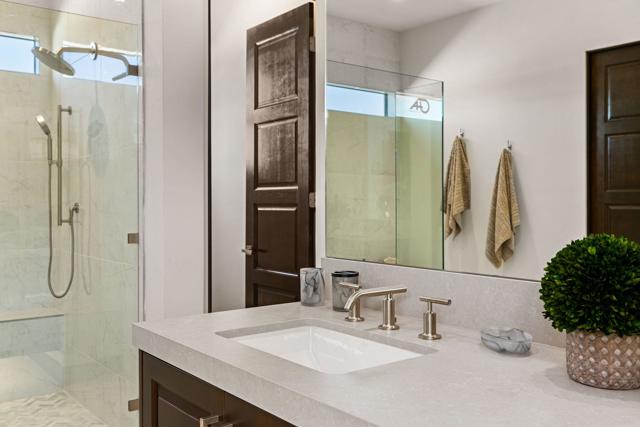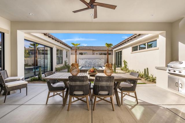 Newly built, model home being sold fully furnished! This is the largest GHA Collection floor plan within the gates of the Province Indian Wells. A seamless blend of Mediterranean architecture and modern design, the home features highly appointed finishes throughout. With 3 bedrooms, including a casita, plus an office and movie theatre. Designed for entertaining, one wing of the home boasts an open-concept design with gourmet kitchen, butler's pantry, walk-in pantry, dining area, family room, and a built-in bar complete with beverage center, ice maker, and a large wine fridge with multiple sliding doors lead out to the pool. The primary suite has a private wing, accessed via a long hallway with clerestory windows featuring an electric fireplace and a spa-inspired bathroom retreat. The third wing of the home includes a bedroom with private ensuite, home theatre, and the attached casita that includes a living area, kitchenette, laundry, and courtyard entrance. Outdoor living features include saltwater pebble-finish pool with colored LED lights, expansive waterfall, built-in BBQ, pool bath, owned solar and more. Just minutes from El Paseo, golf, tennis, dining, and shopping. A rare opportunity to own a turnkey desert retreat, ready for the season and beyond!