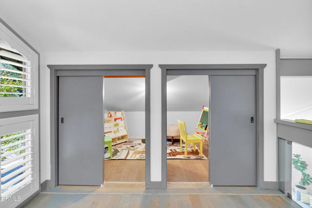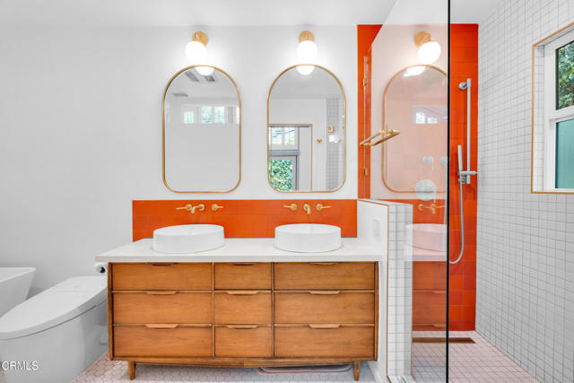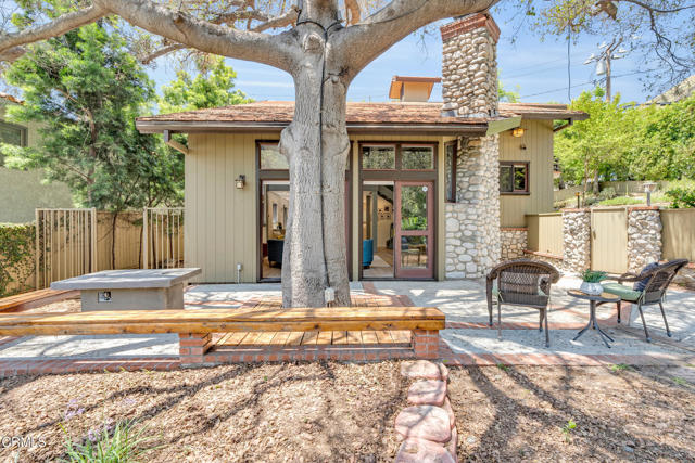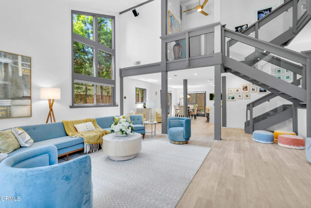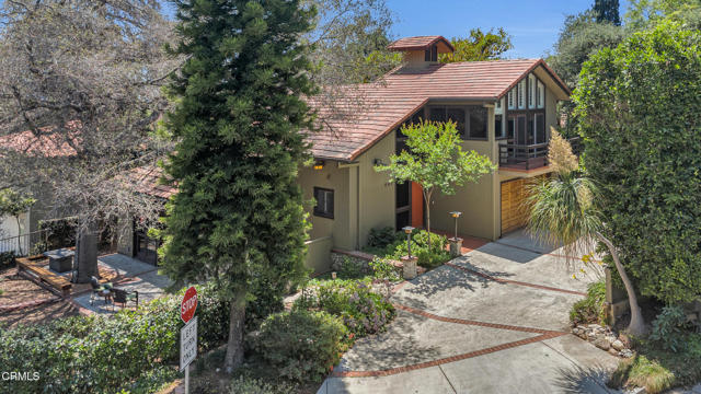 Nestled in the charming Marlborough Terrace neighborhood of Sierra Madre - this timeless modern home awaits. Step into the living room and prepare to be wowed: soaring two-story ceilings and expansive floor-to-ceiling, wall-to-wall windows flood the space with natural light, seamlessly blending the serene outdoors with the refined interior. Lush greenery and breathtaking mountain views complete the picture, creating a tranquil yet dramatic living experience. An open-concept floor plan connects the living room/dining area to a completely remodeled gourmet kitchen, complete with a center island and pantry. Outfitted with modern conveniences, it makes meal prep effortless and enjoyable. A striking open-riser staircase with sleek glass railing enhances the home's expansive and airy feel. The primary suite delivers the second 'wow' factor with its soaring vaulted ceiling and walls of windows that frame breathtaking, therapeutic mountain views. Morning coffee on the private balcony will quickly become a cherished daily ritual. The suite was completely remodeled in 2020 and includes a luxurious spa-like bathroom, a walk-in closet, and custom window shutters. Two additional bedrooms share a balcony, offering more outdoor enjoyment. At the top of the stairs, a large nook provides flexible space for storage or a cozy play area for the children (or favorite pets). All bathrooms have recently been completely remodeled. Just outside the kitchen, an outdoor barbeque area provides the perfect setting for entertaining, whether hosting friends or enjoying intimate family gatherings. Expansive sliding doors from the living room open to a cozy front yard, creating a seamless indoor-outdoor living experience.