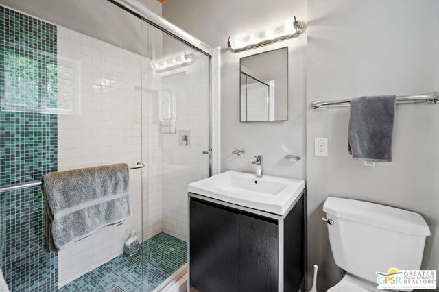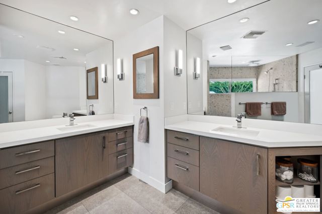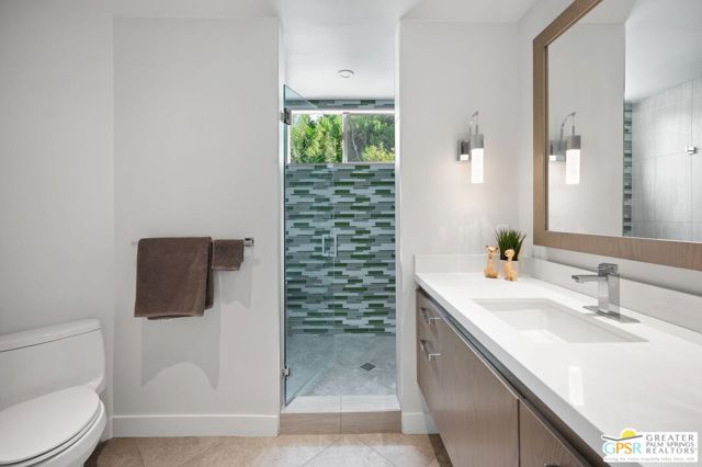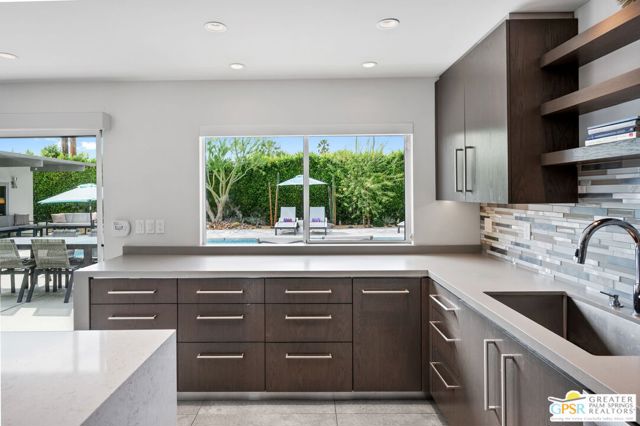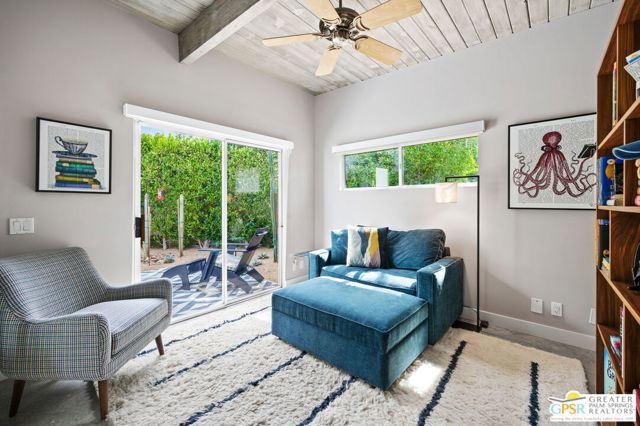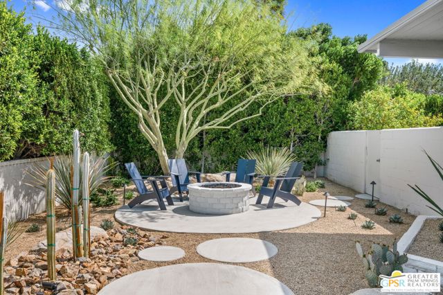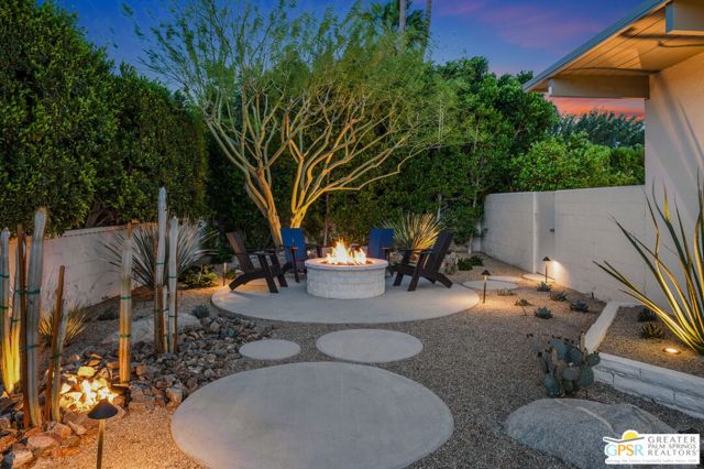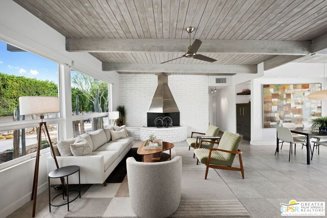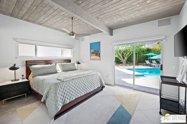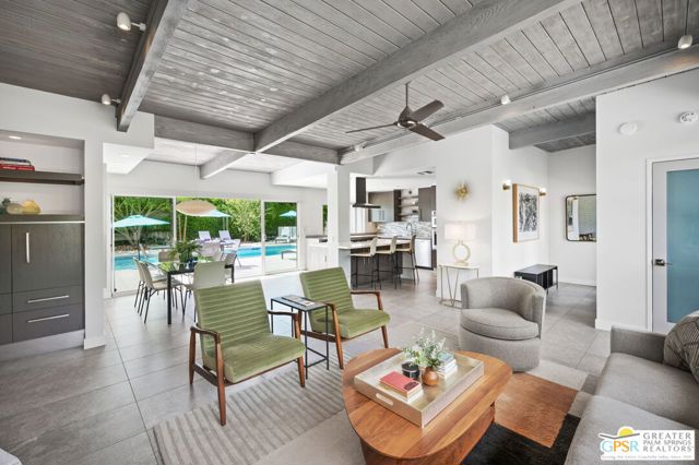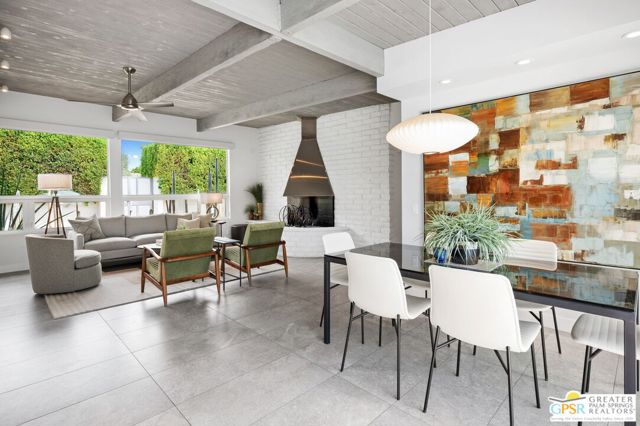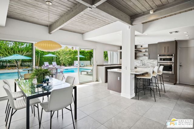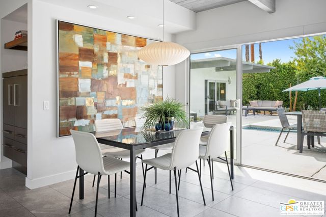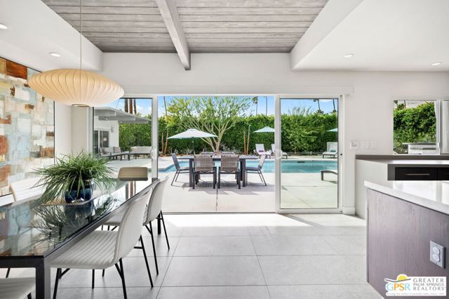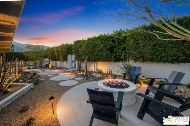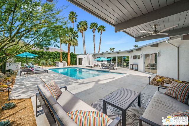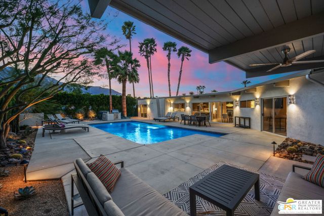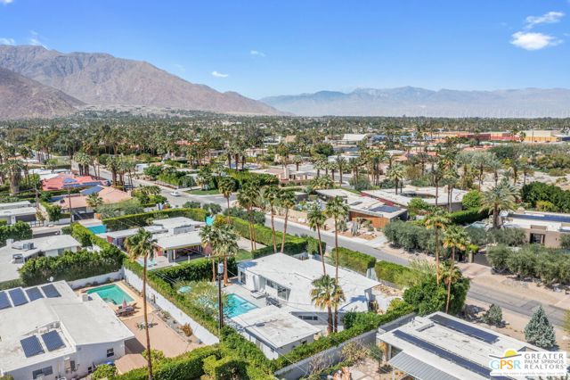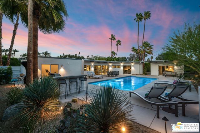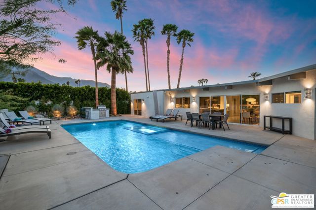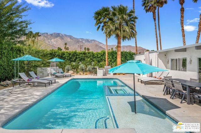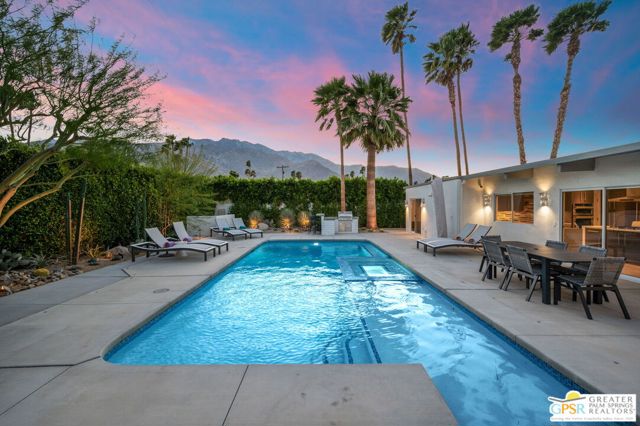 Tucked behind a lush privacy hedge, this spectacular mid-century modern residence is the crown jewel of the block where timeless design meets sophisticated upgrades and stunning mountain views steal the show. Expansive walls of glass flood the interiors with natural light, seamlessly blending indoor and outdoor living. The resort-style saline pool and professionally designed garden create an oasis of relaxation and beauty, framed by mountain vistas and curated landscape lighting. At the heart of the home, the chef's kitchen centers around an oversized island, perfect for both casual mornings and lively gatherings. The main house offers three serene bedrooms including two with direct outdoor access and two spa-inspired bathrooms that exude luxury. Designed for entertaining, the outdoor spaces shine with a brand-new built-in BBQ and bar seating, an inviting fire pit for starlit evenings, and a detached poolside casita complete with wet bar and jaw-dropping views, your guests will never want to leave. Every detail has been elevated: fresh interior and exterior paint, automated irrigation, a burnished steel fireplace sculpture with new gas piping, and a newly added gym space tucked into the garage. Modern conveniences abound, from the Vivint smart security system with cameras, locks, and thermostat, to remote-control electric shades and an EV charger. Situated in the coveted Movie Colony East neighborhood, close to Ruth Hardy Park and the Uptown Design District's acclaimed dining and shopping, this home offers iconic Palm Springs architecture paired with today's most desirable amenities. Offered fully furnished, it is truly the ultimate expression of desert living.