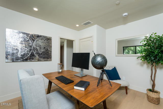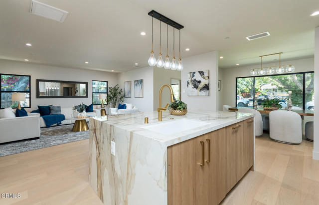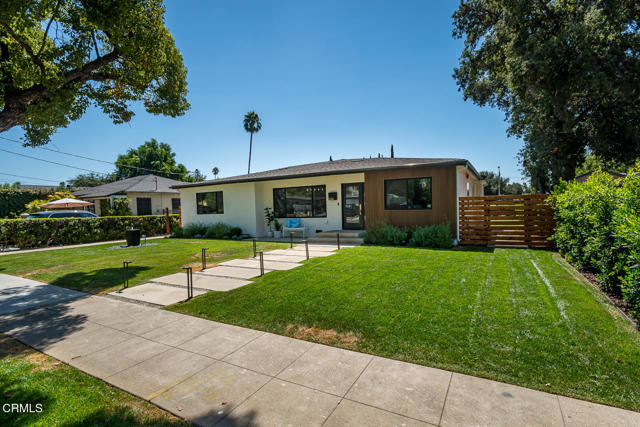 Beautifully expanded and extensively rebuilt, this reimagined Pasadena ranch blends classic charm with contemporary design, combining thoughtful design with modern comfort. A floating paver walkway leads to a striking entry defined by clean lines, picture windows, and a warm modern facade, setting the tone for the light-filled interiors within.The great room unfolds in open, graceful rhythm--airy and inviting, with wide-plank floors, abundant natural light, and seamless flow between living, dining, and kitchen. The living area is open yet intimate, ideal for gatherings or quiet evenings at home. The dining room, framed by expansive windows overlooking the manicured front lawn, creates a refined setting for both everyday meals and entertaining. At the center, the chef's kitchen anchors the space--a striking composition of form and function with a waterfall island, Thermador appliances, pot filler, custom cabinetry, appliance garage, under-cabinet lighting, and a beautifully tiled backsplash that ties the space together with quiet sophistication.Just off the entry, a versatile room with garden views serves perfectly as an office, den, or guest bedroom. Down the central hallway, two junior suites anchor the hall on either end, each with a private bath, while a chic powder room and a stylish laundry room with quartz counters, chevron tile backsplash, and generous cabinetry occupy the center, completing this thoughtfully arranged private wing with both practicality and polish.At the end of the hallway, the primary suite awaits to the right--a serene, light-filled retreat with a sitting area, walk-in closet, and sliding doors opening to a new deck. The spa-inspired bath features dual vanities, a frameless glass shower, soaking tub, and a separate water closet with bidet feature, creating a calm sanctuary to begin and end each day.Outdoors, the backyard extends the living experience with a new deck, lush landscaping, and a rare street-to-street lot enhancing both privacy and function. A custom automatic gate opens to a rear driveway and an oversized detached finished garage with paneled door and Tesla charger. The spacious lot also offers flexibility for a future ADU.Set on a peaceful tree-lined street moments from the Rose Bowl, Brookside Park, and Old Town Pasadena, this timeless home offers sophistication, warmth, and Pasadena charm. Don't miss this amazing modern ranch.