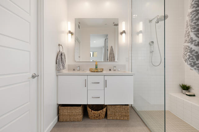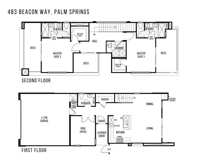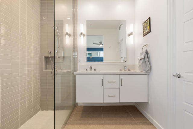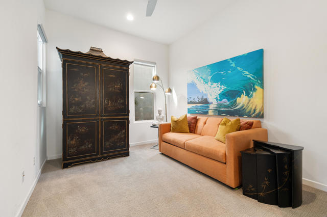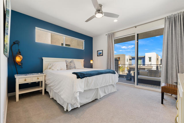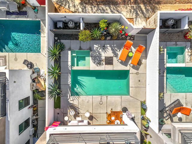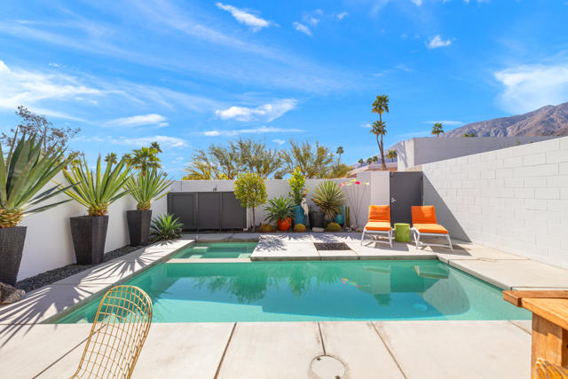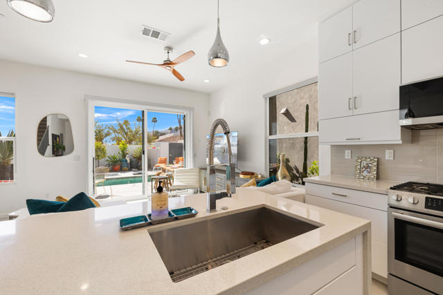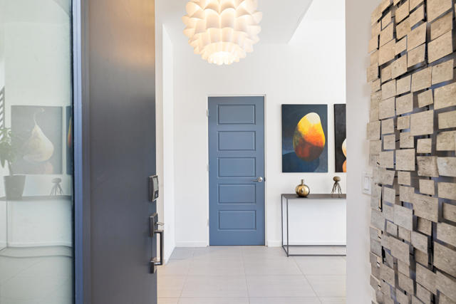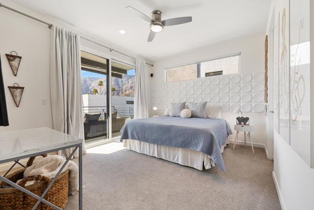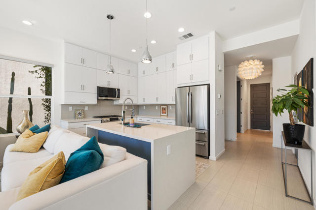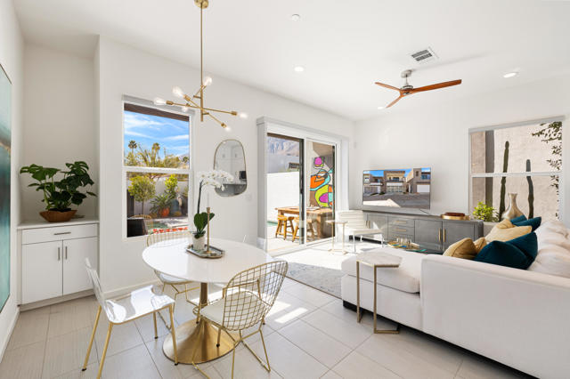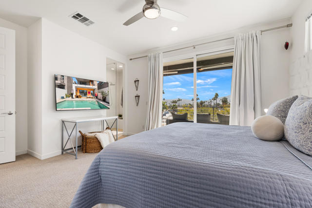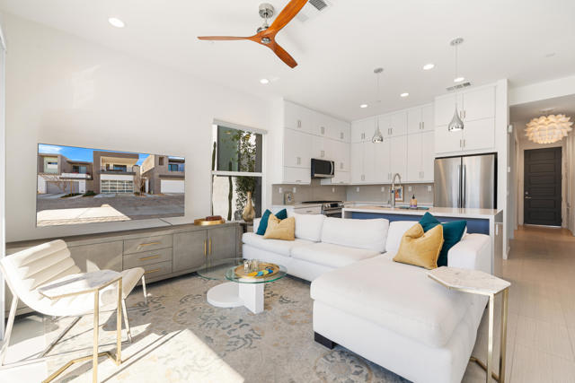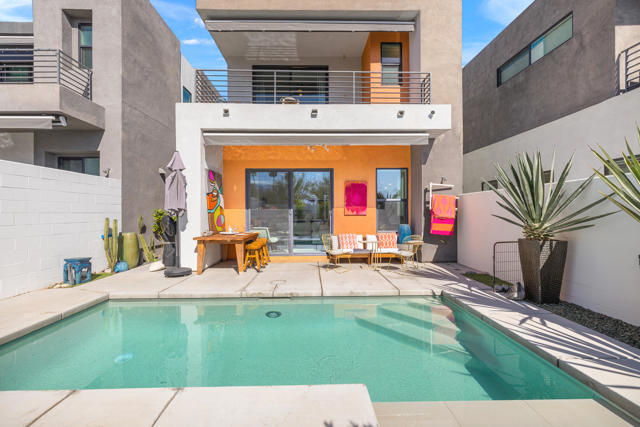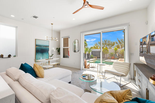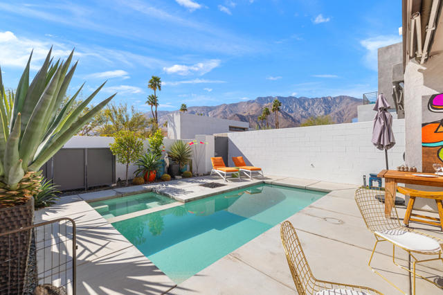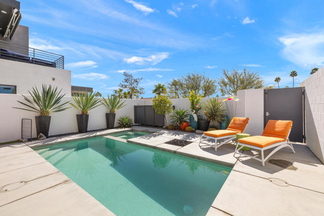 ICON, a private gated community where striking modern architecture meets effortless desert living, minutes from vibrant downtown Palm Springs. This DETACHED (no shared walls) modern residence offers 2 bedrooms + Den/Office, 2.5 baths, and approximately 1,558 sq. ft. of living with a private saltwater pool/spa and panoramic mountain views.Step inside to soaring 12' ceilings, abundant natural light, and thoughtfully designed interiors. Highlights include 8' interior doors, smooth drywall finish, quartz countertops with waterfall edge, and a sleek modern kitchen with contemporary flat-panel cabinetry, stainless steel appliances, a large single-basin sink with Grohe high-arch faucet, and a spacious island with bar seating, perfect for entertaining.Upstairs, elevated 9.5' ceilings enhance the two primary en-suite bedrooms, each with walk-in closets and private balconies. A versatile downstairs den/office, complemented by an expansive upper balcony and convenient upstairs laundry.Upgrades include owned Tesla Solar System, whole-home water softener, bidets in every bathroom, and motorized awnings. Energy-efficient features include high efficiency insulation, radiant roof barrier, and energy efficient heating/cooling system. Outside, your private oasis awaits, with a saltwater pool and spa, outdoor shower, lush landscaping, built-in gas firepit, and freshly repainted concrete, offering the ultimate indoor-outdoor living experience.A finished two-car garage completes this 2018-built home on fee-simple land (not leased). ICON delivers modern desert living with privacy, luxury, and low-maintenance convenience.