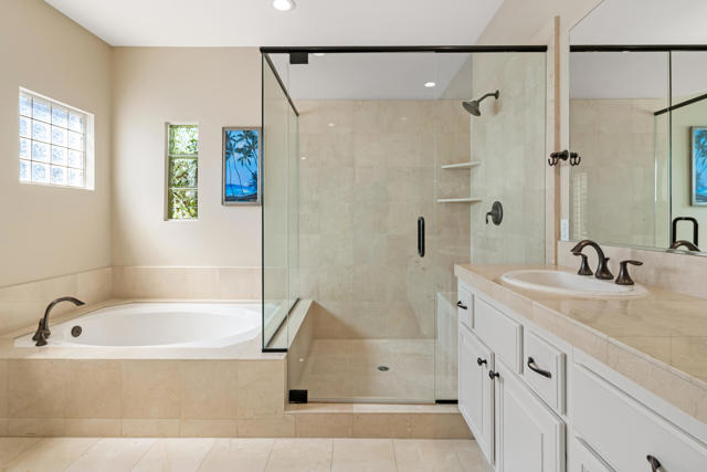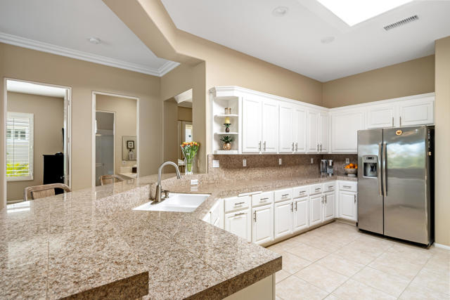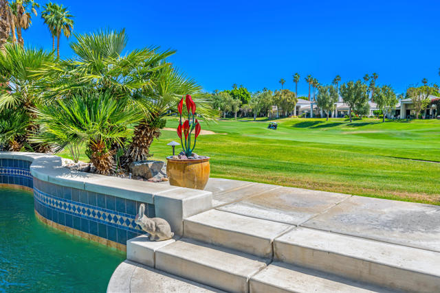 Located on the 2nd hole of the Palmer Private Course at PGA WEST this beautifully appointed 2-bedroom home PLUS office or 3rd BEDROOM offers 2,026 square feet of stylish living space. Enjoy your morning coffee as the sun rises and later in the day dive into relaxation in the refreshing pebble tech pool, or unwind in the spa as your private paradise awaits! This great room style home's has a kitchen that is a chef's delight featuring all stainless steel appliances, including a sleek double oven, generous counter space and lots of cabinet space. The refurbished cabinets, self-closing doors and drawers add a touch of elegance, while the kitchen skylight, custom lighting and LED can lights create the perfect ambiance throughout the home. The HVAC system, water heater, and toilets are a few of the recent upgrades. Ceiling fans in the bedrooms and plantation shutters offer a cool retreat on warm days, complemented by custom roll-down window shades in the living areas. The private outdoor space with pool and spa plus large retractable awning is perfect for entertaining guests. The pool heater pump and salt system have been replaced, making pool maintenance a breeze. The 2 car PLUS golf cart garage has new doors and openers. This wonderful home is sold FURNISHED per inventory.