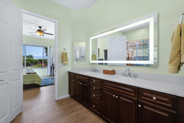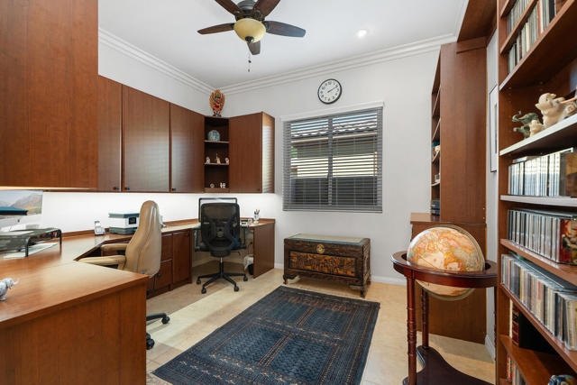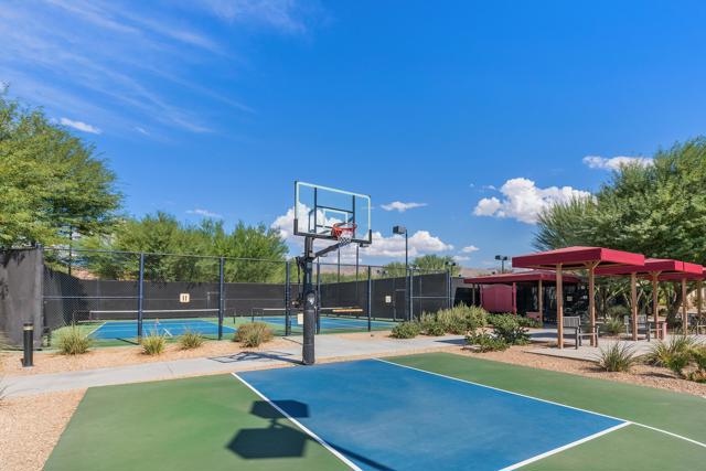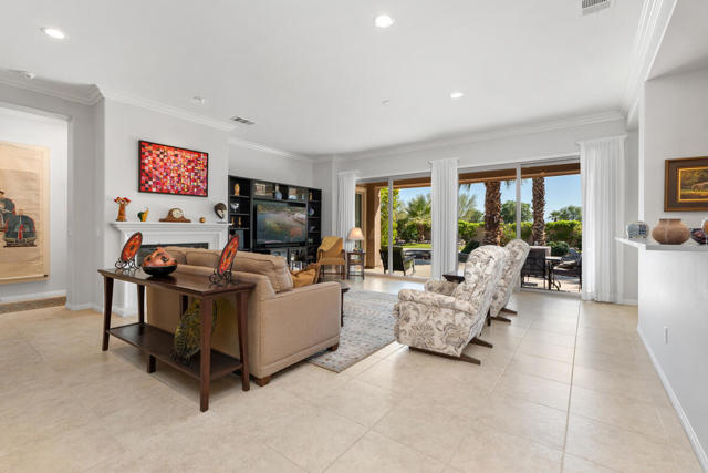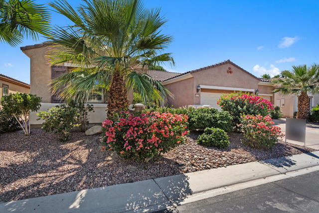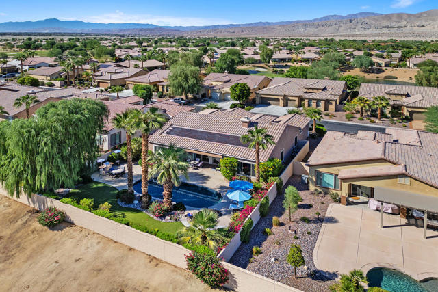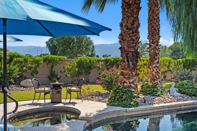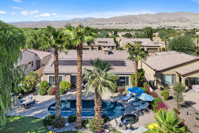 Wait till you see the spectacular panoramic view of the Santa Rosa Mountain range from your estate sized pool home that offers luxury living year-round. This home has been recently refreshed and is ready to move-in! The property is being offered by the original owners, who have added numerous upgrades and amenities. Enter through a paver front courtyard to a living/dining room featuring large glass sliding doors that offer clear mountain views. The Dorado model home features large rooms, two bedroom suites, and an office or den situated between them. The primary suite features a remodeled walk-in shower, and closet with triple rod storage and built-in laundry hampers. The kitchen has been recently updated with white cabinets, a Fisher-Paykel two-drawer dishwasher, Cambria stone countertops and backsplash, and is open to the living area and sunroom/kitchen dining space. There is a half bath for guests and a large utility room that includes plenty of storage for all the essentials and supplies from Costco shopping!This floor plan is one of the few in the community with a full three-car garage. This one includes epoxy floors, NEW mini-split AC, tankless water heater, and built in cabinets and overhead storage.The truly premium south facing lot of over 10,000/sf provides you room to stretch out and enjoy the desert weather. The Black Pearl pebble tech pool is equipped with a 4 hp 'Badujet' SWIMJET, which is a swimmer's exercise dream, with a bubbling spa to loosen those muscles after your swim (all Pentair pool equipment). The low maintenance turf landscaping only enhances the view and the time to relax in your own desert oasis. Inside, there is a fireplace for use during cooler winter evenings. The upgrades list goes on with TILE FLOORS throughout except the guest suite, CROWN MOLDING, energy efficiency with the PULTE energy-saving package that includes extra insulation and dedicated solar cells. NEW Anderson windows installed on south and west sides of house for extra efficiency. The garage has an ELECTRIC CAR CHARGER. Sun City Shadow Hills is a premier 55+ community, and this home is just a short walk to the Santa Rosa clubhouse & fitness center for gym, pickle ball, tennis, bocce ball and a Nationally ranked Executive par 3 golf course.