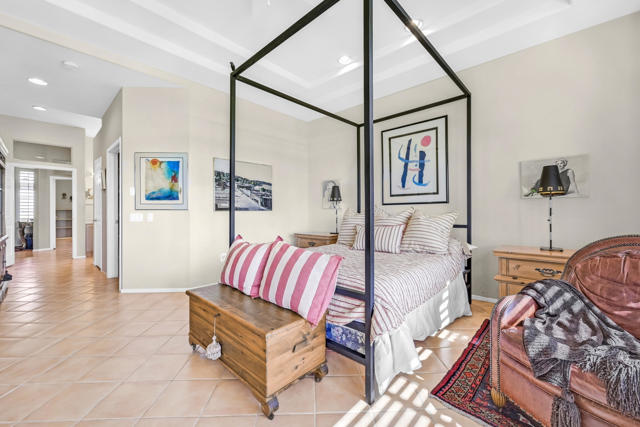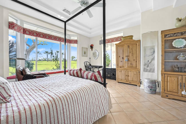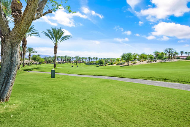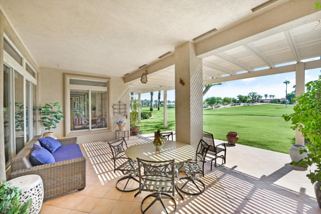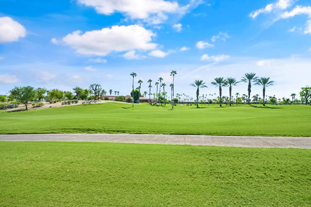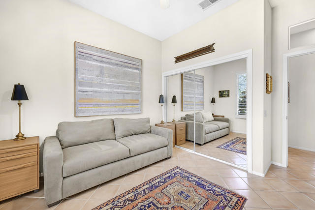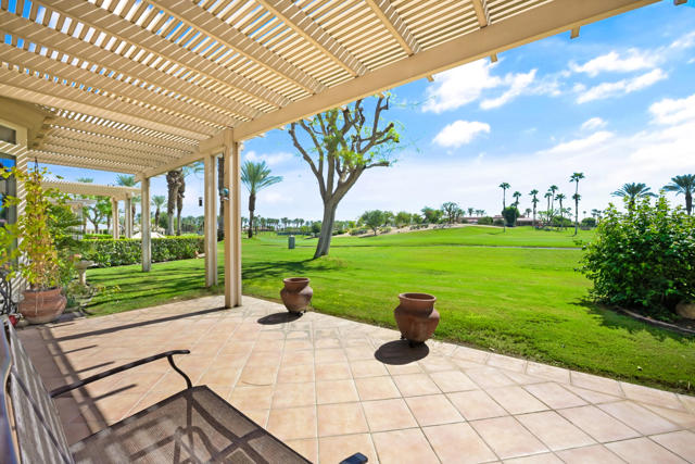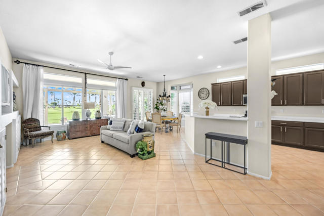 Welcome to Heritage Palms, a premier 55+ gated golf course community in the Coachella Valley. This beautifully maintained single-story home offers 1,707 sq. ft. of living space with tile flooring throughout and a prime golf course setting on Hole #2 of the 18-hole championship course. Inside, you'll find a spacious living/dining room combo with a cozy fireplace, a versatile den, and plantation shutters. The kitchen features stainless steel appliances, a walk-in pantry, a breakfast counter bar, and ample cabinetry. The primary suite is highlighted by a large picture window with seating, while the en-suite bath includes dual vanities, a walk-in shower with grab bars and a built-in bench, and a generous walk-in closet. An additional bedroom and bath provide comfortable accommodations for guests. Step outside to a covered patio with tiled flooring, perfect for enjoying sweeping golf course views year-round. As a resident of Heritage Palms, you'll enjoy access to the 18-hole championship golf course, clubhouse, fitness center, indoor and outdoor pools, tennis and pickleball courts.