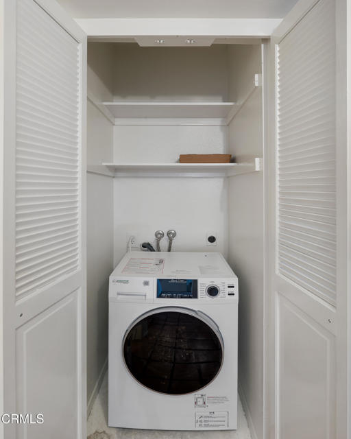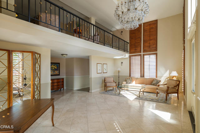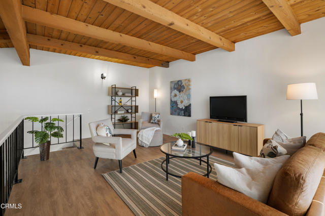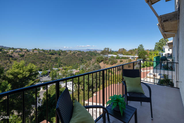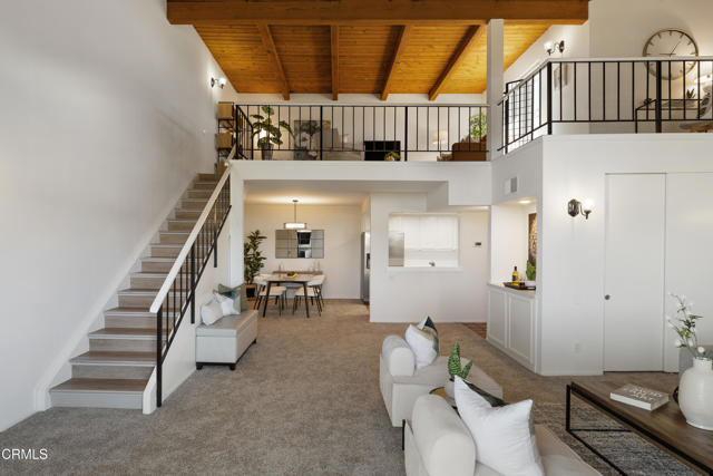 Tucked away in the tranquil hills of Bel Air, Chateau Chamberay offers the perfect blend of privacy, comfort, and classic California charm. This one-bedroom condo, featuring a spacious loft and potential for creating a second bedroom, is situated within a secure, beautifully maintained community surrounded by breathtaking views that stretch toward the Pacific. Entering through the terracotta-tiled entry, you're welcomed into an open-concept living space with soaring vaulted wood-beamed and plank ceilings, fresh carpet, and abundant natural light. A dry bar with a quartz countertop adds a touch of sophistication, while large picture windows and an inviting balcony capture stunning sunsets and panoramic mountain views. The kitchen features terracotta tile floors, tile countertops, recessed lighting, and crown molding, complemented by a Whirlpool electric range, an above-range microwave, a brand-new GE dishwasher, and a stainless steel Samsung refrigerator. Thoughtful touches continue with custom storage beneath the staircase that leads to the versatile loft, ideal for an office, guest space, or creative studio. The primary suite welcomes you through double doors into a serene retreat with west-facing views, a walk-in closet, new carpet, and wood-look vinyl plank flooring leading to the ensuite bath featuring a tiled walk-in shower with a rain showerhead, a single-sink vanity with tile countertops, and a new Kohler toilet. A second full bathroom with a tub and shower combination, along with a brand-new in-unit combination washer and dryer, completes the interior. Residents of Chateau Chamberay enjoy access to resort-style amenities, including a sparkling pool, spa, sauna, fitness center, and tennis courts, all within a secure gated environment. The home also includes two assigned tandem parking spaces, assigned supplemental storage, and convenient access to the 405 freeway, the Getty Museum, West LA, and nearby beaches. Experience hillside serenity and timeless Bel Air living in this inviting retreat with captivating sunset views.
