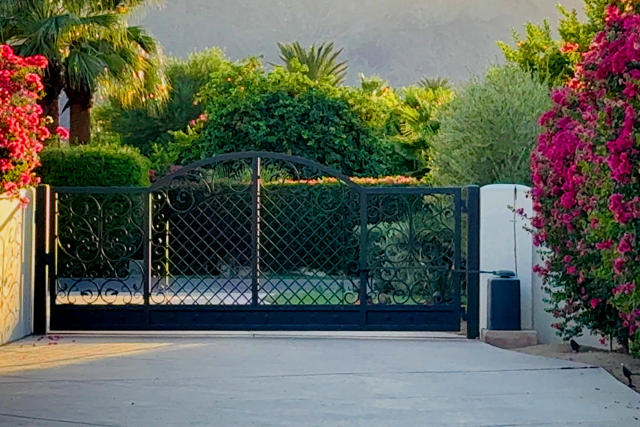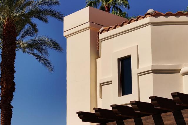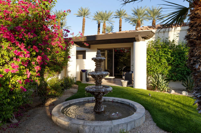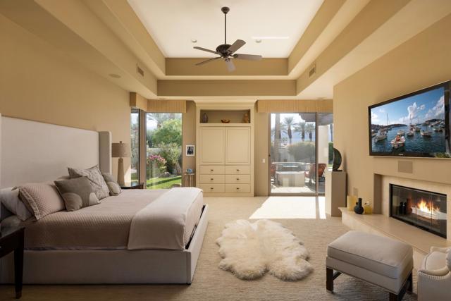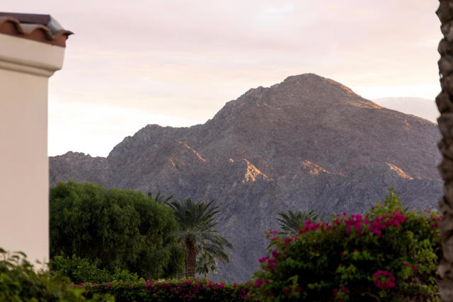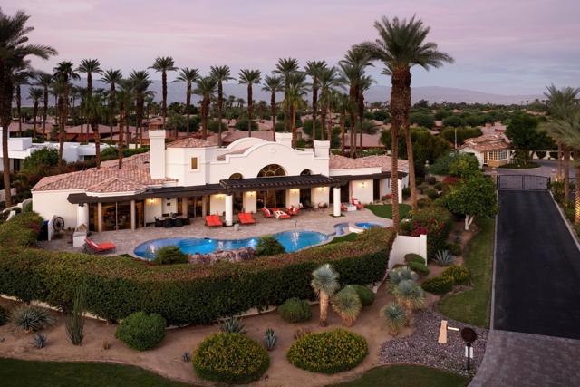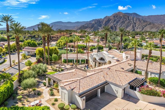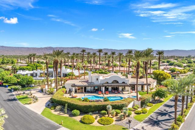 This spectacular Montecito-style estate sits on nearly a full acre in the heart of La Quinta, at The Estancias, a private gated enclave of only 49 custom estates. Offering 6,061 square feet of living space and nearly 360 degree mountain views, this home is designed for those who value privacy, scale, views and seamless indoor-outdoor living.The residence includes 4 ensuite bedrooms, 7 bathrooms, and a spacious guest casita with private living quarters which are enhanced by five independently controlled temperature zones for optimal comfort and efficiency.At the heart of the home is a chef's kitchen, anchored by a dramatic copper hood over a 48-inch gas cooktop. Outfitted with double ovens, dual dishwashers, twin Sub-Zero refrigerators, and walk-in pantry, the kitchen flows into an eat-in dining space and family room with fireplace, creating a warm gathering hub for everyday living or entertaining on a grand scale. The primary suite occupies its own wing, complete with sitting room, double-sided fireplace, and dual spa-style baths, with two large walk-in dressing rooms, double steam shower and jetted tub. Massive windows on both sides of the suite frame mountain views in every direction.Outdoors the estate shines with exceptional amenities, including a resort-size saltwater pool and spa (with solar heating system), firepit, fans and misting system under the loggia. .A circular drive for guests and gated car park, oversized three-car garage with golf cart bay and plentiful storage, plus a deeded Coach parking space with full hookups that doubles as a catering and event staging area. Lush landscaping and layered patios provide countless spots to watch the moon rise over the North Patio stage as the sun sets behind the Santa Rosa Mountains--a setting that is both dramatic and serene.Perfectly situated, the property is steps from world-class golf at Rancho La Quinta Country Club, The La Quinta Country Club, Tradition, Hideaway, Madison, Mountain View, and other premier golf, equestrian and social clubs as well as shopping and dining in Old Town La Quinta. Indulgent escapes await at The La Quinta Resort & Spa, while the Indian Wells Tennis Garden and El Dorado Polo Fields offer world-class events nearby. Private air service, just 15 minutes away, connects desert tranquility with global convenience.This estate combines privacy, sophistication and a true sense of desert living, making it one of La Quinta's most desirable offerings.