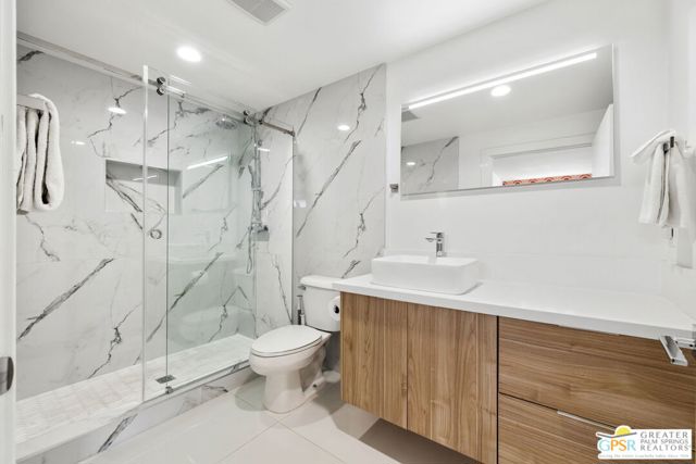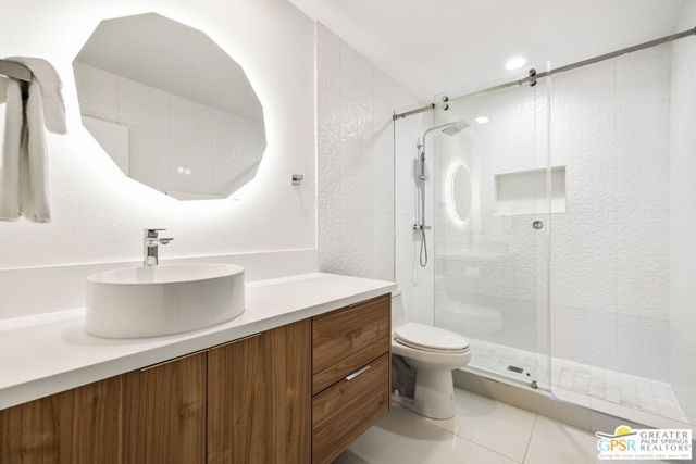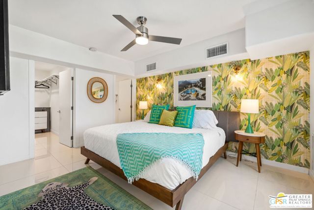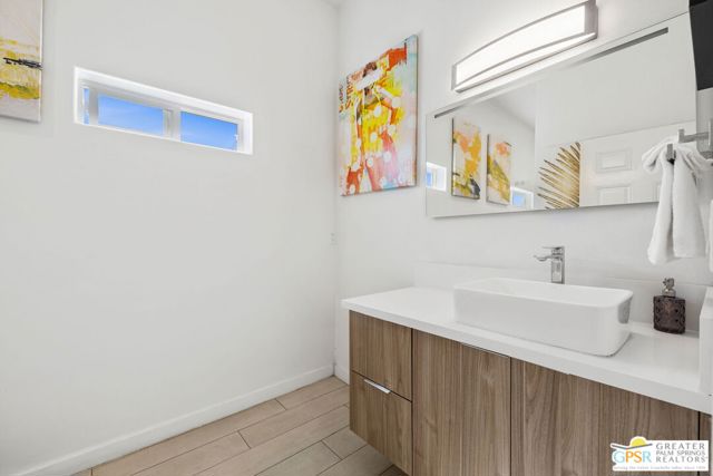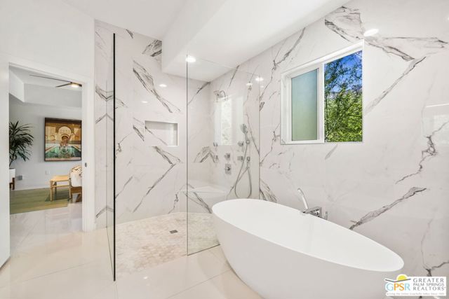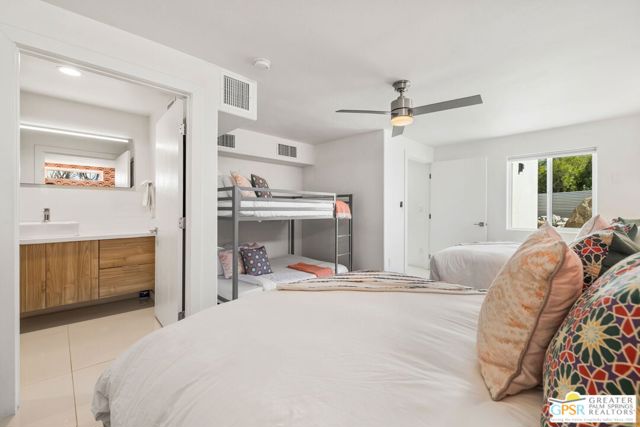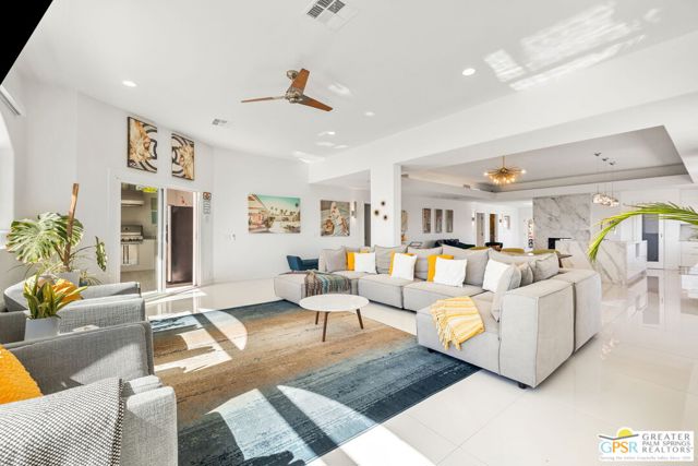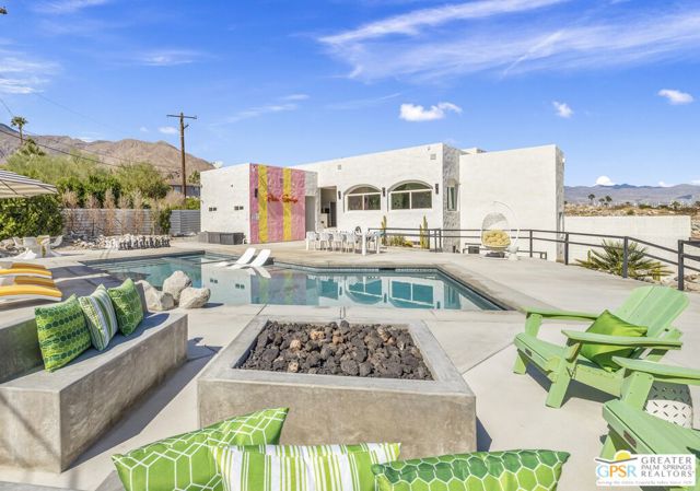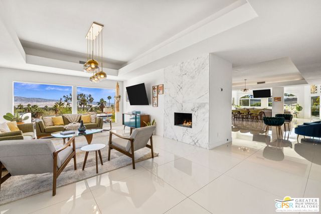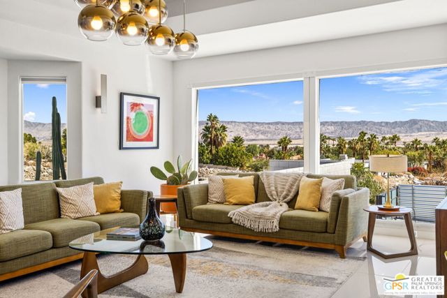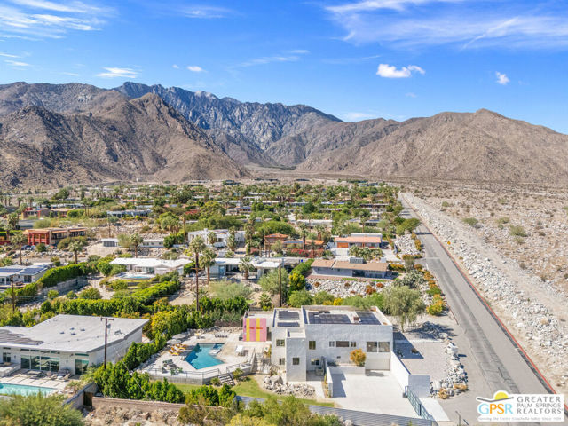 Palm Springs reveals its most striking perspective from this Chino Canyon perch, where the San Jacinto Mountains and open desert form a backdrop of pure drama. This exceptional property delivers a rare blend of privacy, scale, and style. The estate-sized lot of more than seventeen thousand square feet frames a beautifully reimagined residence where contemporary design meets effortless comfort. The interiors move gracefully between formal and informal living areas, anchored by a chef's kitchen featuring a ten-foot marble island, professional-grade appliances, double ovens, and two dishwashers for effortless entertaining. Four ensuite bedrooms are positioned on two levels for ideal separation and flexibility. The primary suite includes a soaking tub and private washer and dryer, while the secondary suites open directly to the pool terrace. Outdoor living shines with a forty-three-foot saltwater pool with Baja shelf and spa, surrounded by multiple lounging areas, a fire feature, and a large grassy lawn. The outdoor kitchen with full refrigerator and dining area makes entertaining easy. Evenings are spectacular under custom lighting that highlights the desert landscape. Additional highlights include a second laundry area near the pool bath, an EV-ready garage within the gated motor court, rooftop solar in place, and turnkey furnishings. Take the Matterport Virtual Tour for a better sense of flow. The best of Uptown Palm Springs is a short hop away.