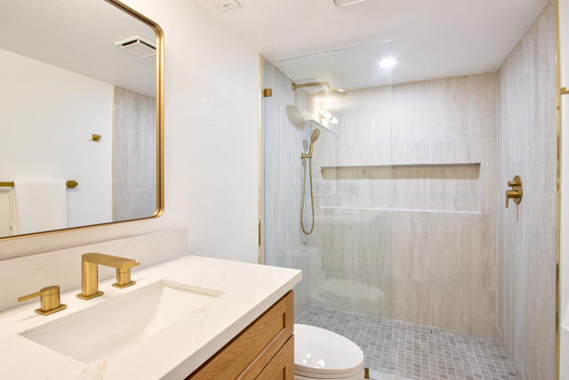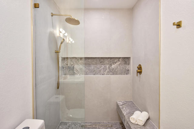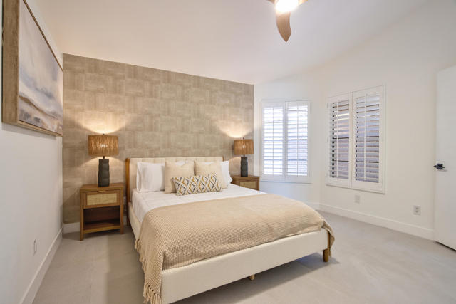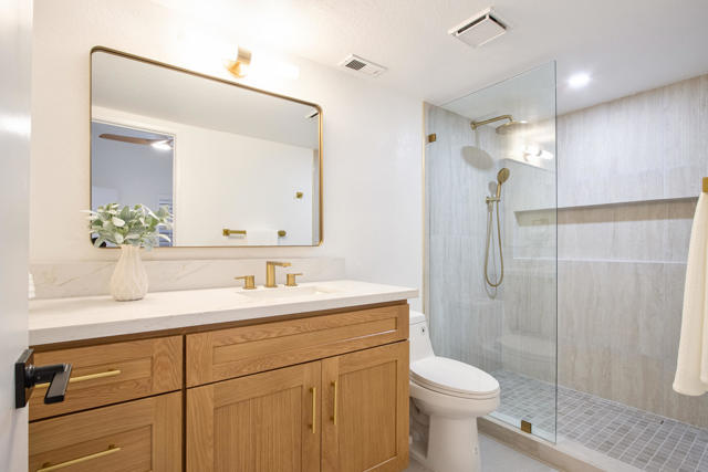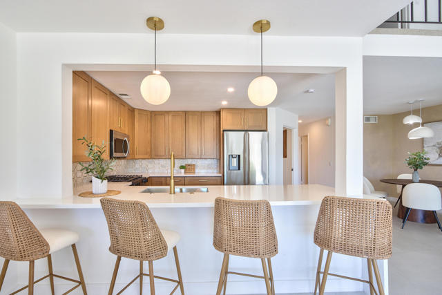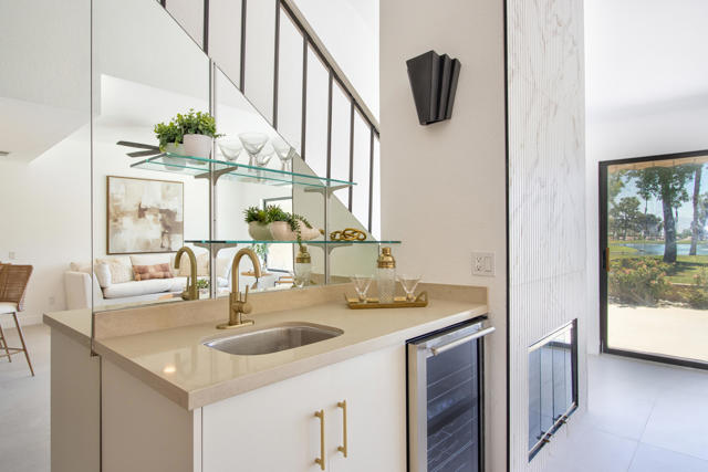 Amazing Designer Remodeled Condo Behind The Gates Of Woodhaven Country Club. Located on the 6th green, this spacious home features 1,808 sq ft of open living space abundant natural lighting and high end finishes throughout. The newly designed kitchen features custom cabinetry, quartz countertop with waterfall edging and new appliances. The home has a great room flow with high ceilings & the kitchen opening to living space and golf course & lake views. Elegant, fluted floor to ceiling fireplace is adjacent to wet bar with wine fridge and dining area. The primary suite has the entire dedicated second level with custom wallpaper and a great secondary space overlooking the golf course perfect for a home office, workout area or reading room. The primary bathroom has walk in shower & clean minimalist designer finishes. Guest bedroom has beautiful en suite bathroom. Den/Office area can easily be utilized as a 3rd bedroom. The amenities at Woodhaven CC include 7 tennis courts, 4 pickleball courts, and a full-service clubhouse. HOA dues cover cable TV, high-speed internet, HBO, Showtime, landscaping, community pools, guard gate security and exterior home maintenance, including the roof. Owners qualify for discount golf as well! Remodel was just completed by local designer, Violet Moran. This is an amazing opportunity to live the desert golf lifestyle of Palm Desert and feel like you are at a resort while enjoying incredible designer finishes of a newly remodeled home.