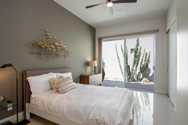 Unlock and love your lifestyle... your luxury, turnkey desert pied-a-terre, ready when you are. Lock and leave this low to no maintenance property, this sleek, single-story residence is located in the coveted 18@Twin Palms community and offers 1,793 square feet of modern architecture and effortless style. With a private plunge pool and spa and a compact, easy-care yard, it's the perfect retreat for those seeking sophistication without the upkeep.The only available home in this highly sought-after enclave, this former model blends bold contemporary design with refined finishes and seamless indoor-outdoor flow framed by dramatic mountain views. Inside, soaring 10-foot ceilings and an open-concept layout flood the space with light. Three bedrooms and two spa-inspired bathrooms feature designer 24x24 tile flooring, plush carpeted suites, and smooth-finish walls throughout. A striking freestanding Malm Cone fireplace anchors the living room with a touch of midcentury luxury.The chef's kitchen is a showpiece of form and function, offering Fisher & Paykel appliances, custom cabinetry, solid quartz countertops, and premium Grohe and Kohler fixtures--ideal for both relaxed living and stylish entertaining.Expansive panoramic sliders open to an intimate private resort setting, complete with your own plunge pool and spa, professionally landscaped gardens, and total privacy--all with minimal upkeep.Additional features include 18 owned solar panels with WiFi monitoring, a built-in security system, surround sound, a two-car garage with epoxy flooring, ample storage, and the option to purchase most furniture and select art for a true turnkey move-in.Whether you're seeking a full-time residence, a lock-and-leave luxury getaway, or a smart desert investment, 743 E Twin Palms Drive delivers the ultimate in modern Palm Springs living--set in stylish South Palm Springs, moments from the desert's most iconic dining and lifestyle destinations. Furnishings and some art work is available. Open daily during modern week 2/12 - 14 - 11:00 - 2:00.