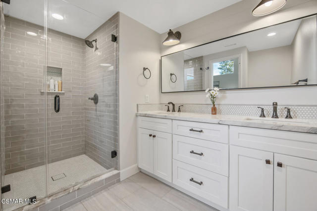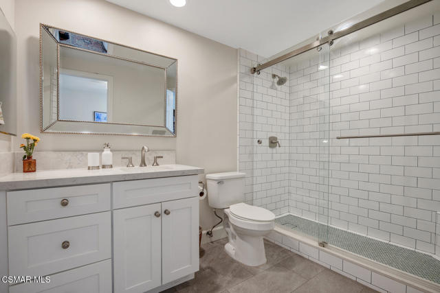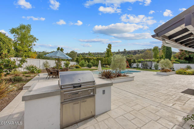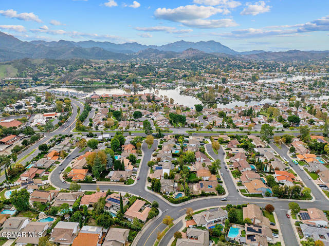 Tucked away on a peaceful cul-de-sac in the beloved First Neighborhood, this impeccably remodeled residence offers the perfect blend of sophistication, comfort and relaxed California charm on 1/3 of an acre, the largest lot in the community!Completely updated, this stylish, contemporary home welcomes you with an abundance of natural light and a modern, casual elegance. The open concept living and dining areas overlook lush views and lead directly to the rear yard, creating a seamless indoor-outdoor flow. The chef's kitchen features quartz countertops, a gorgeous herringbone backsplash, stainless steel appliances with a matching farmhouse sink, and a generous breakfast bar that flawlessly transitions into the great room / family room, highlighted by a cozy, chic fireplace that is framed by built-in bookshelves and cabinets. There is also a formal dining area, perfect for everyday dining or effortless entertaining.The main-level also boasts a veritable private ''wing'' with its own entrance, large living area and en-suite bedroom, creating a fabulous option for multi-generational living, a guest suite, home office or a second living area. An additional powder room and indoor laundry round out the first floor. Upstairs, the primary suite provides a tranquil retreat with dual closets and dual sinks, while two additional bedrooms with Plantation shutters share a beautiful full bathroom with dual sinks and an oversized tub / shower.Outside, the newly redesigned, thoughtfully appointed expansive yard exemplifies the quintessential Southern California dream! A sparkling PebbleTec spa and pool with a Baja shelf, a fire pit, built-in BBQ station with seating, dining spaces, gathering areas, electric shades, hardscape, park-like grass, fruit trees, garden boxes and serene, mature manicured landscaping all create your private oasis.Top it all off with newer solar panels and two back-up Tesla batteries, EV charging for two vehicles, a three-car garage (one bay is currently being used as an office), a newer HVAC system, warm-inviting light wood floors, custom touches throughout and its proximity to the lake, trails, golf, Westlake Village's vibrant shopping, dining and entertainment scene and award-winning schools...an absolute must have!