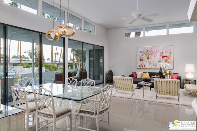 In South Palm Springs iconic Canyon Estates, this architecturally significant Charles Du Bois residence captures the best of 1970s desert modernism with clean lines, clerestory windows and seamless indoor-outdoor flow. Sited on a serene interior street, this home enjoys a north facing orientation that frames the San Jacinto mountains in full dramatic scale from the largest private patio in the community. Soft morning light, shaded afternoons, and glowing sunsets create an outdoor living experience that is unmatched in the neighborhood. Inside, the generous floor plan offers two large bedrooms, three bathrooms and a large den or office that can also become a bedroom, providing excellent flexibility for modern living. The expansive great room encompasses the living room, dining room, and a chic full-size wet bar all opening through walls of glass to the terrace, drawing the mountain views directly into the home. The kitchen and breakfast room elegantly respect the original plans of the architect and open onto the terrace as well. The primary suite is generously proportioned with an oversized bath, dressing area, multiple closets and direct access to the terrace, offering mountain views from the moment you wake up. Canyon Estates offers a true resort style living experience with an executive nine-hole golf course, fifteen pools, twelve spas, a clubhouse, fitness room and tennis courts. HOA dues of $925 per month include exterior landscape, exterior building insurance, exterior paint, pest control, premium cable and internet. The community sits just minutes from Indian Canyons and Andreas Hills, providing immediate access to some of Palm Springs most beautiful hiking trails and natural preserves while being just minutes from downtown's shopping, dining, and entertainment. Balancing architectural pedigree, expansive outdoor living and a premier South Palm Springs location, 2324 Camino Vida is a unique and timeless offering.