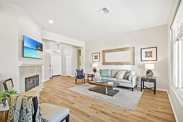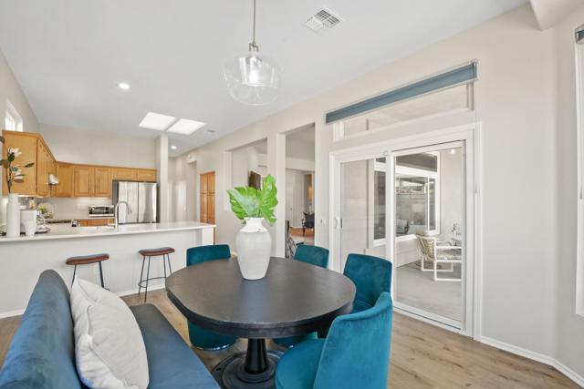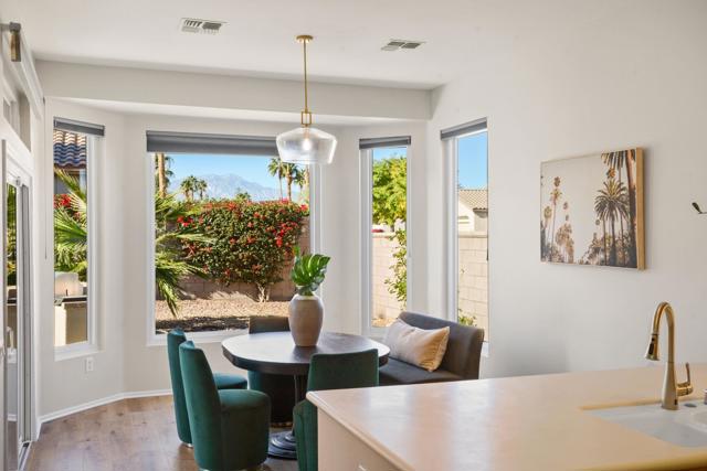 Sun City Palm Desert Home located in the North Section on a premium corner lot with mountain views from the kitchen/dining area and guest bedroom. Interior refresh completed with new flooring throughout, paint & new appliances. Seller replaced all original windows dual paned windows. Primary shower remodeled. Beautiful, light & bright Tangier floor plan with the optional Extended guest room with it's own entrance, bay window in main bedroom. Extended garage. 2 bedroom plus flex room for den or bedroom. Enclosed front Courtyard and front walkway upgraded with stone look coating. Extended garage, golf cart nook has extensive storage in custom cabinetry and overhead Storage. Easy care landscaping with orange tree. Close to the Lake View Clubhouse. Ready now for your enjoyment of the Sun City lifestyle with extensive amenities offering fabulous amenities of resort style Dining, Pools, Spas, Putting Course & Fitness Center, all at a reasonable monthly association fee.
