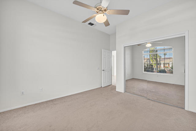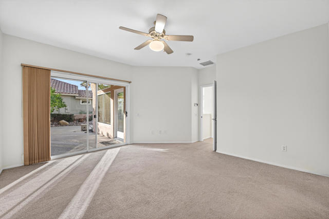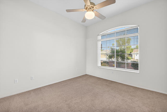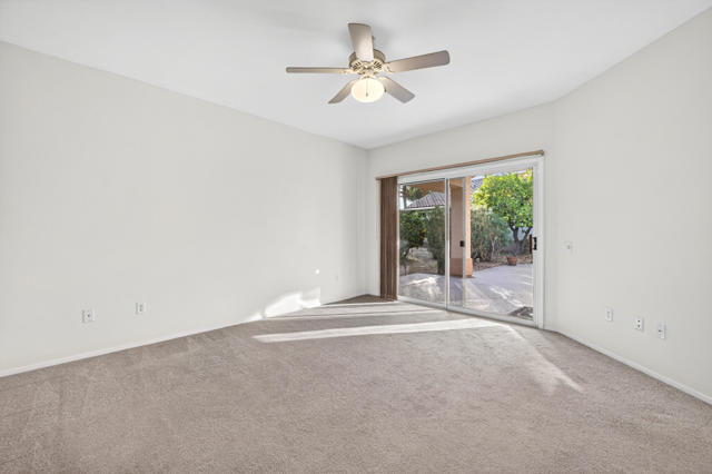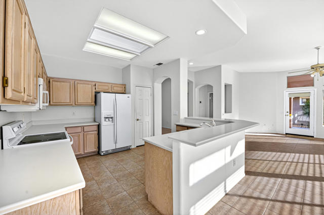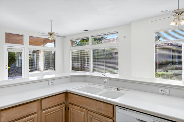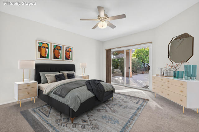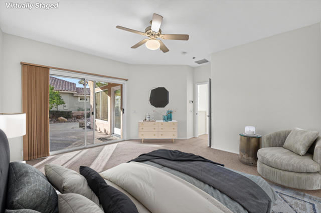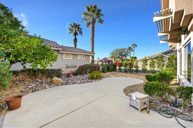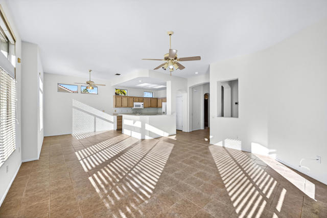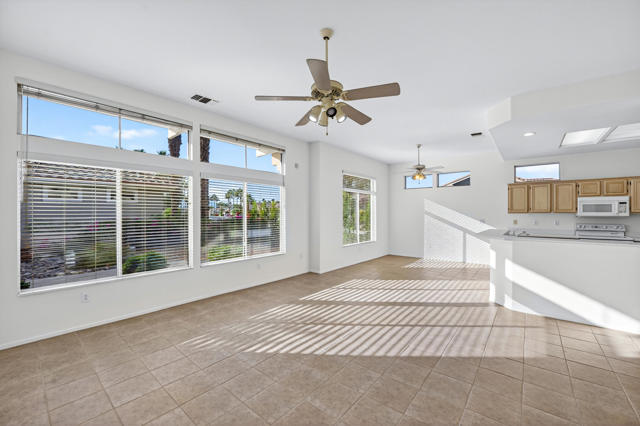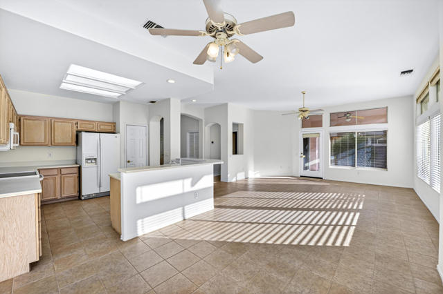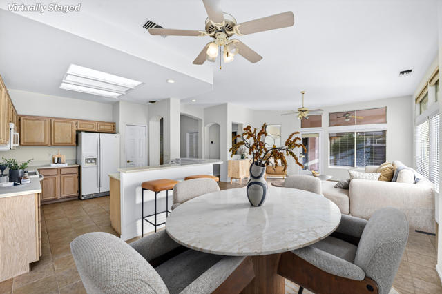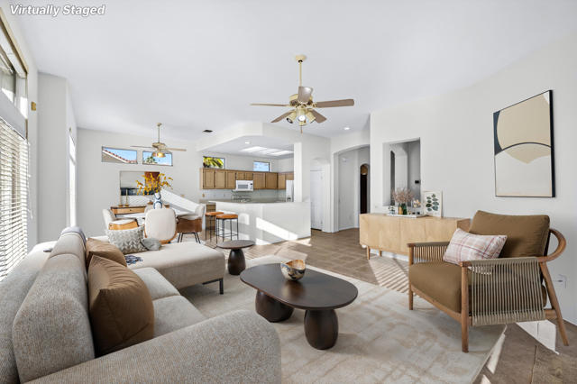 Located on a desirable corner lot in the premier 55+ active adult community of Sun City Palm Desert, this inviting Towle floor plan offers 1,475 square feet (EST.) of thoughtfully designed living space. Built in 1994, the home features a weep screed and is filled with natural light and an open, welcoming layout ideal for both everyday living and entertaining. The spacious great room showcases vaulted ceilings, tile flooring, and expansive windows that flood the space with sunlight. The open-concept kitchen offers ample cabinetry, generous counter space, a breakfast bar, skylights, and clerestory windows--creating a bright and airy setting for casual meals or hosting guests. Large windows and sliding glass doors provide seamless indoor-outdoor living and open to a private patio surrounded by mature desert landscaping--perfect for morning coffee or relaxing evenings. The primary suite serves as a comfortable retreat with a walk-in closet and an en-suite bath featuring dual vanities and a spacious walk-in shower. A guest bedroom and nearby full bath offer flexibility for visitors or a home office. Additional highlights include ceiling fans throughout, laundry conveniently located in the attached garage, and a new garage door and motor installed in May 2025. The corner lot location enhances privacy and curb appeal with low-maintenance landscaping. Sun City Palm Desert residents enjoy recently updated clubhouses, newly repaired streets completed in 2025, championship golf courses, multiple pools, fitness centers, tennis and pickleball courts, walking trails, and a vibrant calendar of social activities--all set against beautiful mountain backdrops.