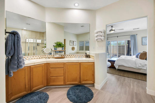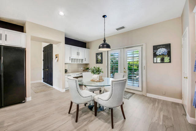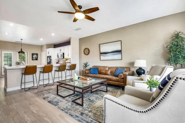 Experience upscale desert living in this beautiful 3-bedroom, 2-bath home nestled in the prestigious 24-hour guard-gated Lake La Quinta community. Spanning over 2,200 sq. ft., this stylish residence offers a seamless blend of comfort and sophistication. A private gated courtyard sets the tone for peaceful mornings or tranquil evenings.Step through grand double doors to discover soaring wood-beamed ceilings, panoramic Santa Rosa Mountain views, and an inviting open-concept layout perfect for entertaining. The chef's kitchen is a standout, featuring quartz countertops, sleek white cabinetry, stainless steel and black Bosch appliances, double ovens, a wine fridge, and upgraded fixtures flowing effortlessly into the cozy family room with a fireplace.The spacious primary suite offers direct backyard access and a spa-inspired en-suite bath with dual vanities, a soaking tub, separate shower, and a large walk-in closet. Two guest bedrooms, a full bath, and a dedicated laundry room complete the interior.Outside, unwind in the peaceful backyard oasis featuring a rock waterfall and lush landscaping. A 3-car garage provides plenty of space for parking and storage. Furniture is negotiable, offering added flexibility for the next owner. Don't miss your chance to live in one of La Quinta's most sought-after communities.