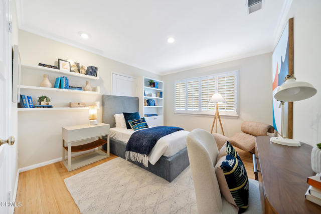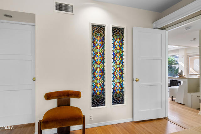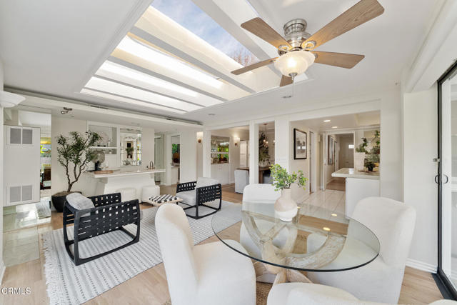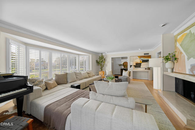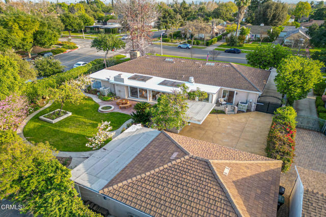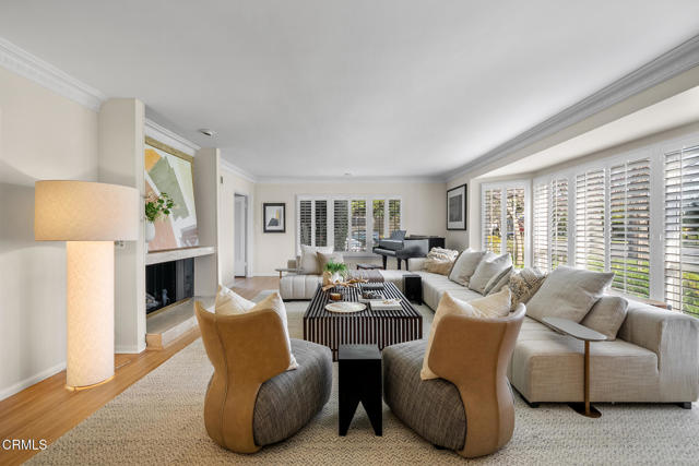 Offered for the first time in 60 years, this sprawling property is situated on a corner lot on a wide residential street. A sweeping front lawn with tiered brick steps leads to a welcoming front porch. The generous entry hall features newly refinished wood flooring throughout establishing a refined & cohesive aesthetic. To the right, the stately living room is filled with natural light from expansive bay windows with plantation shutters overlooking the front yard. A handsome stone fireplace anchor the space, making it well suited for both formal entertaining & everyday living. Double doors open to a library/office with built-in shelving & cabinetry, highlighted by two vintage illuminated stained-glass panels, a fireplace & a sliding door that leads to the side yard. Adjacent to the library is a step-down bedroom with double closets & two walls of picturesque windows of the garden. Adjoining the bedroom, a sunroom filled with natural light from skylights & large sliding doors on 2 sides. Complete with a fireplace & wet bar, this space offers a comfortable setting for casual dining or relaxed conversation while enjoying views of the backyard. Connecting the sunroom & the grand living room is the formal dining area, accented by a sleek chandelier and complementary wall sconces. Nearby, the efficient kitchen is designed with abundant cabinetry & overlooks the rear covered outdoor area. A pass-through window above the sink provides convenient access for serving food & beverages to the covered patio. The adjacent laundry/mudroom includes a utility sink, storage closets, & direct access to the covered patio. Off the long hallway, sunlit with skylights, is the second bedroom with built-in shelving, along with a hallway bath featuring double sinks & a shower-over-tub. This bath connects to an additional wing with a large Jacuzzi tub & sliding door access to the patio. The primary suite offers two bathrooms: one three-quarter bath with mirrored closets & a second full bath with a walk-in closet. The fourth bedroom features a built-in desk & a spacious closet with mirrored doors, as well as a sliding glass door to the back porch with easy access to the driveway. Completing this expansive property are a potting and storage shed, a three-car garage with an attached workshop, & a backyard accented by a small pond, flowering plants, & citrus trees. This well-loved home presents a wonderful opportunity for its next owner to personalize & enjoy for many years to come!!!