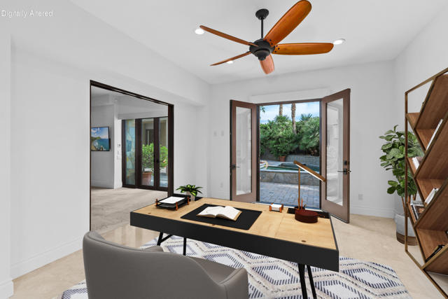 This stunning home in Painted Cove of Indian Wells Country Club is an entertainers delight. Whether on the patio by the pool/spa, or at the barbeque, listening to the water falls or viewing the beautiful mountains from outside or inside by the bar, wine cellar, dinning room or livingarea, each flowing seamlessly one to the other only stopping to view the mountains. This 3800 Sq. Ft. home features 3 bedrooms {One is an attached Casita} an office + 3.5 baths. The primary bedroom is large yet comfy with a fantasy bathroom and walk-in closet. The kitchen is a gourmet's delight with top of the line appliances, counter pace galore and cabinets aplenty. This home and patio entertaining areas afford privacy and elegance. This home has owned solar.
