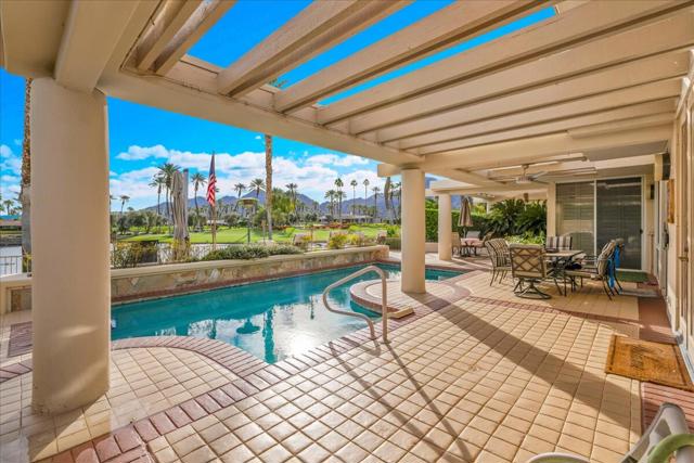 Welcome to your dream home located in the prestigious Desert Horizons Country Club in the very heart of Indian Wells. Close to shopping and performance venues in the Coachella Valley VIP events, such as the BNP Paribis Open, the Coachella Festival, Stagecoach Festival and much more! Beautiful and inspiring 270 degree views of mountains, a serene lake with fountain, and perfectly manicured fairways! This exquisite home boasts 2 bedrooms and 2 baths in the main house. Additionally, a detached casita or a Junior ADU with a lovely spacious bedroom and ensuite bathroom, perfect for accommodating guests or a serene home office space. Solar is paid for and recently added new luxury vinyl plank flooring. throughout the home. Kitchen is newly renovated, a haven for the food enthusiasts! Beautiful and spacious quartz counters, storage sliders for easy retrieving of food staples, new double ovens, dishwasher. The family room includes a bar with views out to the beautiful pool with misting system, plumbed pool cooling system, and awesome views of the lake, mountains and 18th green of the golf course which provide lovely entertaining areas. The soaring ceilings in the living room help flood the space with natural light. The primary suite serves as a private sanctuary with an ensuite bathroom that includes a soaking tub and separate walk-in shower and a huge walkin closet. The second bedroom is spacious with a walkin closet and ensuite bath with a walkin shower. The garage is spacious and includes a golf cart space. plus 3 Tesla Batteries, and charging station. Desert Horizons includes many pools enjoyed by all including water volleyball players and their many fans, tennis and pickle ball courts, a state-of-the art fitness facility, bocce ball games which includes an outdoor bar for the players and their friends, stunning club dining facilities which includes five star meals,top shelf wine selections for diners, fun Friday night Happy Hours and more!,.