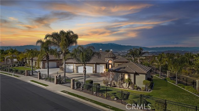 This stunning single-level 4,058 sq. ft. Amberhill estate in the highly sought-after Pinnacle community offers an unparalleled blend of luxury, space, and functionality. Featuring four generously sized bedrooms and four bathrooms, this home is designed for both comfort and entertainment. Outdoor living are, a 12-car garage provides ample room for car enthusiasts, extra storage, or a workshop space, with epoxy-coated floors and ample cabinetry throughout. The garage setup includes a 4-car attached garage, a 6-car detached garage, and an additional 2-car detached garage. Inside, new luxury vinyl plank flooring and plantation shutters enhance the home's modern and elegant aesthetic. The family room boasts a custom-built entertainment center, seamlessly connecting to the open-concept kitchen. A chef's dream, the kitchen features granite countertops, a 48" built-in refrigerator, dual ovens, a walk-in pantry, and a full bar area — ideal for hosting gatherings. Step outside into your private backyard oasis with breathtaking views. Designed for entertaining, the 1,250 sq. ft. outdoor living area includes surround sound, a built-in BBQ, two fire pits, an outdoor refrigerator, and an ice machine. The resort-style pool and spa, easily managed by the AquaLink system, create the perfect retreat. The beautifully landscaped yard features custom pavers, stamped concrete, extensive outdoor lighting, and 24 mature fruit-bearing trees. Additionally, a wrought iron dog run is conveniently located on the side yard. For added security and peace of mind, the home is fully gated and equipped with an 18-camera security system recording 24/7, along with a 12-camera Ring system. Freshly updated with new interior and exterior paint, the property also features new 5-ton and 3.5-ton AC units for year-round comfort. This extraordinary estate seamlessly blends modern amenities, elegant design, and breathtaking outdoor spaces in one of the most coveted communities. Don't miss this rare opportunity — schedule your private showing today!