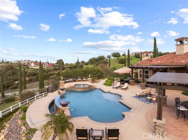Set on 5.65 acres of rolling hills in the serene community of La Cresta, 21051 Via Sevilla is a luxurious 5,152-square-foot single-story estate that perfectly blends elegance, privacy, and the beauty of Southern California's countryside. With five spacious bedrooms, five bathrooms, an office, a game room, a library and an exercise room, this home was thoughtfully designed with every space in mind. Inside, the home impresses with its coffered lighting & natural flow. The gourmet kitchen is equipped with top-of-the-line appliances, ample storage in the oversized walk-in pantry, and a large center island, making it ideal for both everyday living & entertaining. The kitchen connects seamlessly to the generously sized living and dining areas, where large windows invite in natural light and showcase stunning views of the surrounding landscape. The wet bar includes a temperature-controlled wine room that holds up to 400 bottles of your favorite wine. Retreat to the luxurious primary suite, which features two fireplaces, a spa-like bathroom, and two spacious walk-in closets. Each additional bedroom offers en-suite bathrooms, walk-in closets, with thoughtful details throughout the home that reflect quality craftsmanship and design. Step outside to the resort-style pool, spa, and outdoor kitchen area that blends perfectly with the beautifully landscaped grounds and stunning views. The estate includes a charming boutique vineyard — a rare and delightful feature for wine enthusiasts or those who appreciate the art of winemaking. Water your grapes and fruit trees with the home's 100 GPM well. There's plenty of space and flat land to add equestrian facilities, a guest house, ample parking, or simply enjoy the open space and tranquility. La Cresta is known for its peaceful, upscale living, and this property embodies that lifestyle. With breathtaking sunsets, mountain views, and ample room to roam, this estate offers a unique opportunity to live in harmony with nature — without sacrificing comfort or sophistication. Adjacent to La Cresta lies the Santa Rosa Plateau, a protected ecological reserve encompassing approximately 9,000 acres of preserved land. This sanctuary safeguards diverse ecosystems and local wildlife. The Santa Rosa Plateau's commitment to conservation ensures that these landscapes remain undisturbed, offering a peaceful retreat and a glimpse into California's natural heritage. Come see what La Cresta has to offer with nearby hiking, biking & horse trails.