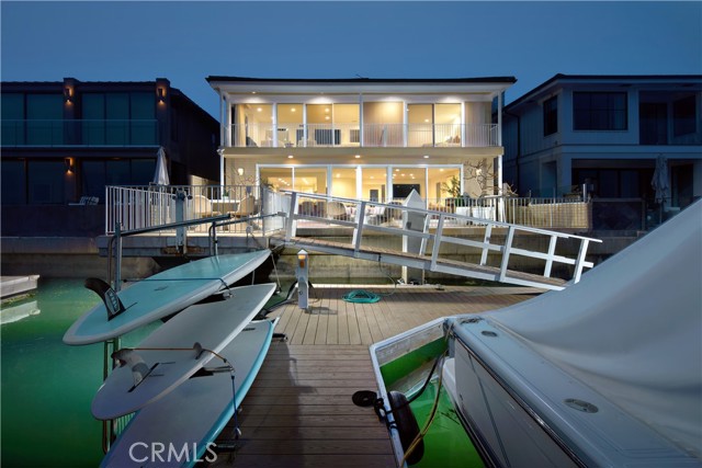 The ultimate expression of Newport Beach's enviable waterfront lifestyle awaits at this classic Mid-Century Modern custom home on guard-gated Linda Isle. With a location on the exclusive island's preferred western edge, the residence offers magnificent views of Newport Harbor, evening lights, sunsets, and sailboats and yachts that gently glide by. A bayfront terrace includes a private dock for a vessel up to appx. 57' and provides an outstanding location for impressive entertaining along the water's edge. Boasting eight spacious bedrooms and seven-and-one-half baths, the generously proportioned home offers an equally welcoming introduction thanks to custom artist-crafted metal and glass gates that open to a large entry courtyard. Grand modern style continues indoors, where a two-story foyer is anchored by a stunning spiral staircase that appears to float on its own while illuminated by floor-to-ceiling windows. Harbor views are enjoyed upon entry to the open and bright residence, which spans approximately 4,598 square feet. Water-view entertaining is destined to be enjoyed in a fireplace-warmed living room and dining room area that opens to the bayside terrace and hosts a step-down walk-in wet bar with wine refrigerator and new quartz countertops. Brand-new quartz also graces the counters and backsplash in a large kitchen that displays frameless white cabinetry, a nook, peninsula bar, two four-burner cooktops, and a built-in Sub-Zero refrigerator. Two en suite bedrooms are located on this level and include one that is perfect as a home office. A large landing at the top of the staircase leads to six more bedrooms, including two that share a bath, an en suite with balcony overlooking the courtyard, and an en suite with spacious bath and harbor-view balcony. The primary suite is enormous and features double entry doors, an intimate lounge, private bath, fireplace-warmed sitting area, and priceless bay views from indoors and a wide balcony above the rear terrace.