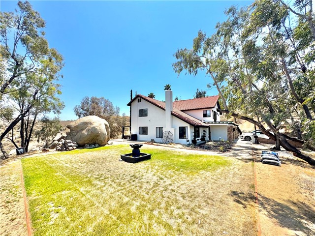 Stunning Spanish-Modern Hillside Retreat in Woodcrest! Experience rural luxury living in this unique two-story home perched on 2 acres with over $125,000 in premium upgrades and unmatched 360° panoramic views of Riverside. A curved rock retaining wall and lighted driveway welcome you to a beautifully landscaped entrance. Enjoy breathtaking sunsets from the 40-ft balcony. Step inside to soaring vaulted natural wood ceilings, custom grey tile flooring, and modern finishes that create a warm and spacious ambiance throughout. The entry level features a formal living and dining area, along with a fully remodeled chef's kitchen featuring a sleek new bar table — ideal for hosting and entertaining. Just off the kitchen, the inviting family room offers a cozy second bar and coffee nook. Upstairs, retreat to three generously sized bedrooms, including a luxurious master suite and a flexible guest room/office overlooking the pool, spa, and hills.Outdoor living shines with a covered patio, retractable sunshades, and serene natural surroundings that offer privacy and relaxation at every turn. A true hidden gem-this property combines modern comfort, timeless design, and breathtaking scenery.
