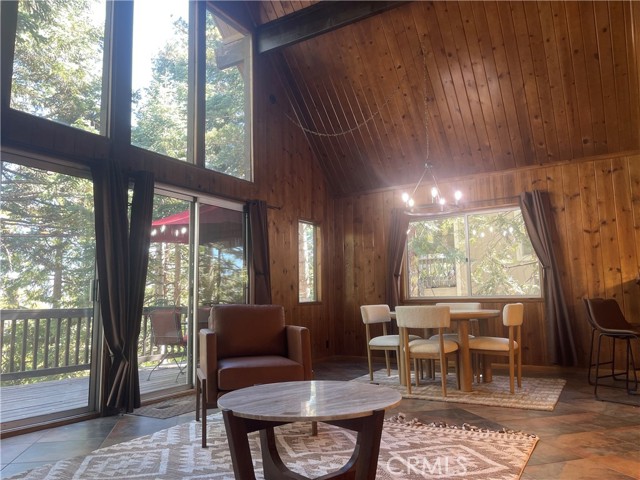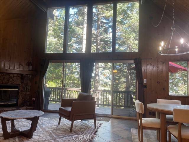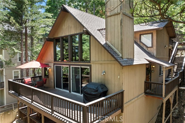 Lake Views from two decks in a Classic Mountain Cabin A-Frame with Lake Rights. Open the front door to where an open floor plan awaits. An expansive two-story Cathedral ceiling roofline opens out to a large deck the full length of the home. Design includes a corner Lava rock fireplace, extra wide sliders, large bank of windows that anchor the living and dining room, extra wide tongue & groove plank paneling combined with great views of Lake Arrowhead and the Lake Arrowhead Village. The kitchen and island/bar are accented in rich, rust brown granite, stainless steel appliances and oversized slate tile flooring throughout. A coveted large bedroom with a huge, full bath is on the first level. Two large bedrooms are located up a floating staircase in a Jack & Jill configuration with a three-quarter bath. Upper level facing Old Toll has tons of windows with dappling sunlight on one side of the home while the other side opens out onto a mezzanine landing that faces the forest view; cozying up the space. One of the bedrooms has an ample sitting area with a great view out a mid-Century triangle shaped window of mountainscapes beyond. The bottom level bonus room/den is appointed with a second corner fireplace, wet bar with sink, island/bar, and enclosed laundry. A second huge deck also has a lake view. A tankless water heater is in finished buildup area with tons of extra storage the whole length of the house. The house has a large two car parking deck, new COPP roof /warranty and alarm system. Additionally, Trex decking under parking platform for firewood and more storage.