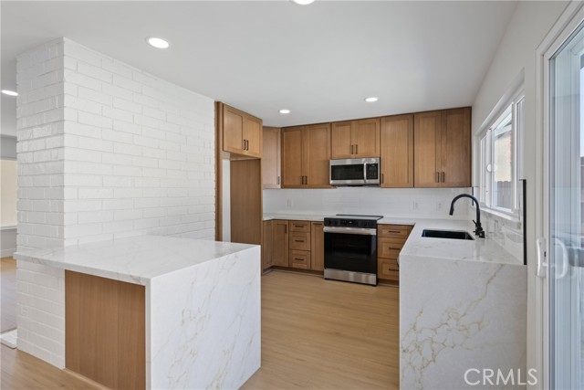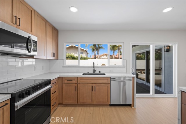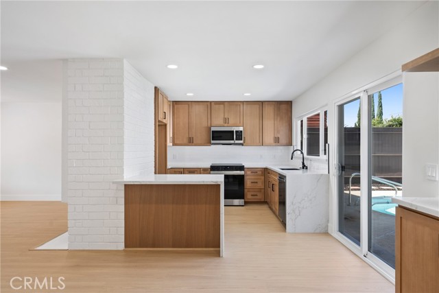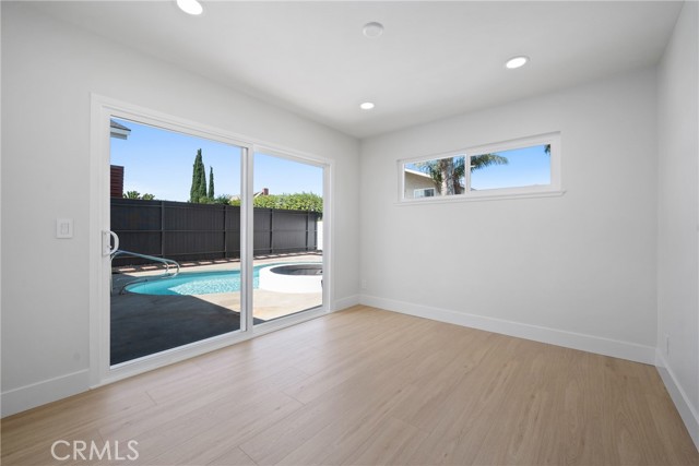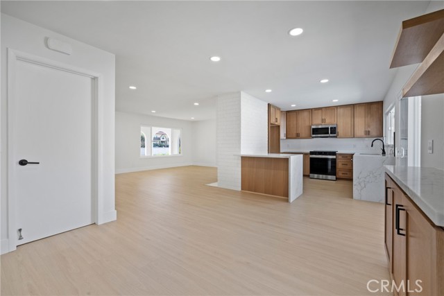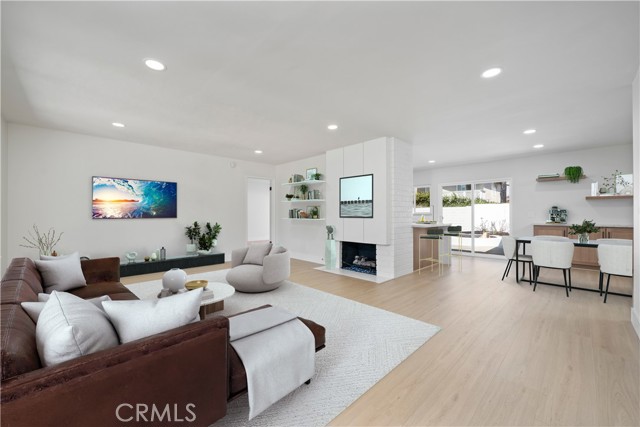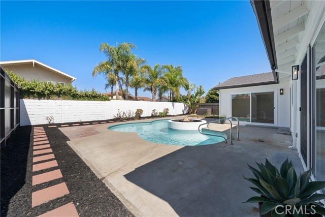 Nestled in the beach close Pacific Sands tract,this fully remodeled,SINGLE-STORY,4-bed home w/NO INTERIOR STEPS,sits on a nicely sized lot w/a POOL & is serviced by HB's top-rated schools.The curb appeal begins w/a refreshed front yard & freshly painted exterior.Entering the home,you're greeted by an open & spacious family room featuring rich laminate flooring,smooth coat finishing on all walls & ceilings,a large window,recessed lighting,a cozy gas fireplace w/brick facade,and an abundance of natural light.The thoughtful layout seamlessly leads into a gourmet kitchen,w/a generously sized peninsula w/breakfast bar,a large window framing views of the entertainer's backyard,quartz countertops w/waterfall edges,a classic white subway tile backsplash,soft-closing white oak shaker cabinetry,& premium Samsung stainless steel appliances.Adjacent to the kitchen is a charming dining area featuring 4 floating shelves,a dry bar,& sliding doors that open to a resort-style backyard.Enjoy a spacious outdoor retreat highlighted by a sparkling chlorine pool,a cozy firepit w/seating area,fresh landscaping w/mulch & pavers,& grass area for kids and/or pets to play,all surrounded by some new fencing w/added height for privacy & block walls.Back inside,in addition to the owner's suite,there are 3 generously sized beds,each updated w/laminate flooring,modern baseboards & recessed lighting.These bedrooms share a beautifully refreshed full hallway bath w/a shower/tub.The spacious owner's suite features a walk-in closet,recessed lighting,sliders to the backyard,& an en-suite bathroom w/large format,porcelain tile floors that lead into a step in shower accented w/ribbon oak tile & matte black finishes,a single panel glass enclosure,& a dual vanity sink w/white oak cabinetry & quartz countertops.Highlights include new dual-pane windows,220V dryer hookups,new appliances & water heater,updated landscaping,fresh interior & exterior paint,new kitchen & bathroom cabinets,countertops,an upgraded pool enclosure.Close to exceptional schools,including Peterson Elementary(w/in the tract),Edison High,a short cruise to world class beaches,& the fine dining,entertainment & shops at Main St & Pacific City!Also nearby is South Coast Plaza,Costco,HB Central Park,Library & Senior Center,HB Sports Complex,the Equestrian Center,Mile Square Park & Golf Course,the OC Fair Grounds & much more!Easy access to freeways and PCH.With many recent improvements,enjoy California coastal living at its finest!