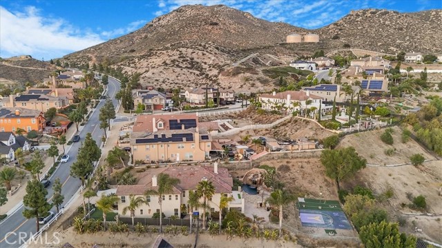 Welcome to Ridge Canyon Estates — one of Norco Hills' most prestigious communities. Perched near the top of the neighborhood, this custom-built estate offers sweeping views of the valley, mountains, and twinkling city lights. A gated driveway leads to your private, peaceful retreat. Inside, soaring ceilings and a dramatic spiral staircase set an impressive tone. To the right, a private en-suite bedroom is ideal for guests or multi-generational living. To the left, a flexible room with its own across from the hallway bath that can serve as an office, gym, den, or additional bedroom. The formal living room features a custom fireplace and French doors opening to a serene water fountain. Adjacent, the formal dining room — with its wine room — is perfect for entertaining, flowing seamlessly into the living area for elegant gatherings. Toward the back, The Great Room opens to the gourmet kitchen and offers built-in cabinetry, a cozy fireplace, and stunning backyard views. The chef's kitchen features stainless steel Viking appliances, a large center island, and a casual dining area overlooking the pool, spa, and dramatic cityscape — making it the heart of the home. Upstairs, a spacious loft offers endless possibilities. The massive primary suite is a true retreat, complete with fireplace, sitting area, and private balcony to take in the breathtaking views. The spa-like primary bath features a dual-sided shower, Jacuzzi soaking tub, dual vanities, the best part unlike other homes in the area - private laundry, walk-in closets, and separate toilet room. Three additional bedrooms complete the upper level — two sharing a Jack & Jill bath with private vanities, and one with its own full bath en-suite. Built-in cabinetry and a custom home theater with 5.1 surround sound finish off the second floor. Step outside to a resort-style backyard, perfect for relaxation and entertainment. Enjoy the custom grotto, pool and spa with slide and waterfall, integrated lighting, built-in BBQ island with kitchenette with refrigerator, TV setup, running electrical and water, and two fire pits. The lower lot includes a half-court basketball area with spotlight and space to add equestrian facilities if desired.