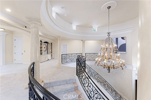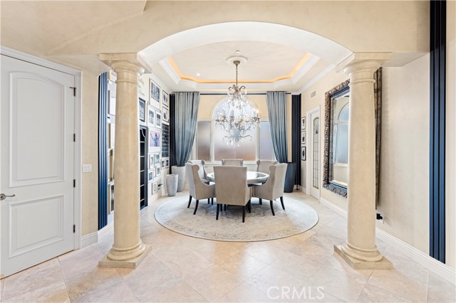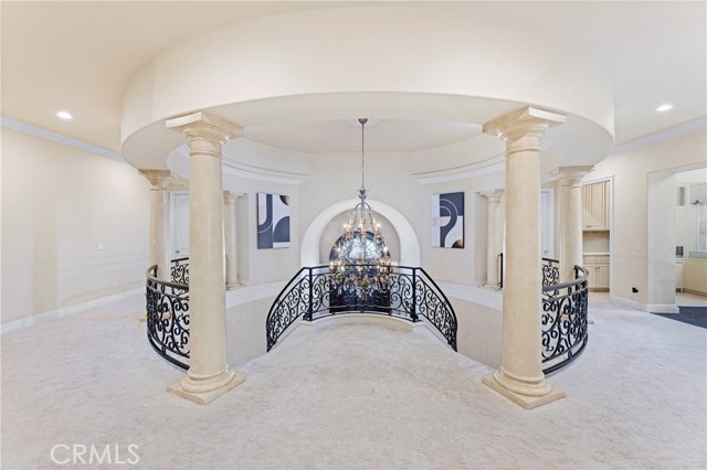 Set on nearly half an acre in Newport Beach's coveted equestrian-zoned enclave, this 7,000+ sq. ft. custom Mediterranean estate masterfully blends timeless elegance with modern luxury. A grand entry with handcrafted double doors opens to a soaring foyer crowned by dual spiral staircases, an architectural centerpiece of the home. Formal living and dining rooms exude sophistication, while the expansive family room offers a wet bar, rear-projection cinema screen, and Crestron home automation. The chef's kitchen features granite countertops, custom cabinetry, a butler's pantry, and professional-grade appliances, all flowing seamlessly into the home's gathering spaces. The primary suite is a private retreat with a fireplace, spa-like bath, steam shower, dry sauna, and custom walk-in wardrobe room. Two upstairs en-suites and two main-level guest suites provide luxurious accommodations. A private elevator serves all levels, including the rare subterranean seven-car garage with its own workshop. Outdoors, a resort-style pool and spa, full-size illuminated tennis court, and lush grounds create the ultimate entertainer's paradise, all just minutes from Back Bay trails, renowned beaches, fine dining and shoping, offering an unmatched locale.