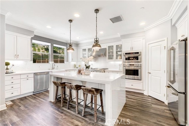 Welcome to your dream townhome in Yorba Linda! This stunning residence truly rivals any model home with designer finishes, custom craftsmanship and nearly $350,000 in upgrades. From the moment you enter, the high ceilings, wide staircases, and open floor plan create a grand yet inviting feel. Throughout the home, you'll find engineered wood flooring that blends durability with warmth, perfectly complementing the custom paint palette, plantation shutters and designer lighting choices that have been selected with care. At the heart of the home is a chef's kitchen featuring professional-grade appliances, quartz countertops, and an oversized island with a waterfall edge. The kitchen is open to a large dining room, enhanced with elegant wainscoting that adds both charm and character. For wine enthusiasts, a custom wine closet with backlighting and a glass door offers a touch of luxury and becomes an instant conversation piece. One of the home's standout features is the seamless connection to its outdoor spaces. Off the dining room, sliding doors lead to one of the largest yards in the community — a rare find for townhome living. This private oasis backs up to a lush hillside, providing greenery and a sense of seclusion that enhances your everyday retreat. The yard has been thoughtfully designed with an intimate seating area, perfect for quiet evenings or gatherings with friends. A custom fireplace and a new patio cover make the space both inviting and functional year-round. Whether you're hosting a summer barbecue or relaxing under the stars, this backyard delivers. The spacious living room is anchored by a custom shiplap wall with built-ins, a cozy fireplace, and access to a balcony with views. Upstairs, the primary suite impresses with mountain views, a walk-in closet, and a spa-like bath with dual vanities, soaking tub, and walk-in shower. Secondary bedrooms feature mirrored closets, with one offering sleek zebra wood built-ins. Car lovers will appreciate the oversized 4-car garage with separate A/C unit, epoxy floors, custom cabinetry, workbench, LED lighting, and vertical lift opener. The home also features smart technology, home audio, and security system, throughout. Set in a highly desirable community, residents enjoy resort-style amenities including a pool, spa, gym, playground, BBQs, and clubhouse. With its premium lot, extensive upgrades, and unmatched style, this 3-bedroom, 2.5-bath home is a true showstopper you won't want to miss!