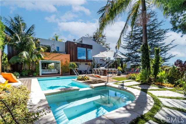 Secluded down a 100-foot driveway, this gated estate offers expansive ocean and canyon views with unmatched privacy. The main level features three bedrooms, including a stunning primary suite that opens to resort-style grounds with pool, spa, cabana, outdoor kitchen, fire-pit, and lawn. Upstairs, an open living and dining area flows into a gourmet kitchen with designer appliances, plus a guest suite with separate entrance and a den/office. Sliding glass doors lead to a large deck with al fresco dining, fireplace, and lounge seating — perfect for enjoying sunset views.