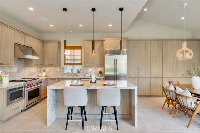 This meticulously upgraded Plan 4 by Irvine Pacific sits on a coveted corner lot in the prestigious gated Barcelona community. Designed for modern living, this 2-bedroom, 2.5-bath home with a versatile loft (convertible to a 3rd bedroom) blends elegance and comfort throughout. The bright, open-concept main level features soaring ceilings and dual stacked sliders that seamlessly connect indoor and outdoor spaces. The remodeled gourmet kitchen is a showstopper, boasting custom cabinetry, striking Quartzite countertops and backsplash, and a premium Sub-Zero/Wolf appliance package — including built-in refrigerator, six-burner stovetop, oven, microwave, wine cooler, and dishwasher. A spacious waterfall island with imported European pendants anchors the kitchen, perfect for entertaining. Adjacent, the dining area offers extended built-in storage, two natural wood-inspired pendant lights, and motorized Roman shades. The living room flows effortlessly onto a private patio with ceramic tile flooring extending outdoors, creating an entertainer's dream surrounded by mature trees for privacy. Upstairs, upgraded stair rails lead to rich Oak wood flooring throughout. The primary suite impresses with vaulted ceilings, abundant natural light, a custom walk-in closet, and a spa-inspired bath with floor-to-ceiling designer tile, dual vanities, soaking tub, illuminated mirrors, and brushed nickel finishes. A spacious second bedroom pairs with a stylish full bath with dual sinks, while a convenient upstairs laundry room and loft — ideal as a lounge, library, or media space — complete the upper level. Premium upgrades include plantation shutters, motorized Roman shades, Lutron Caseta smart switches, a paid-off reverse osmosis filtration and Falsken water softener, paid Enphase solar system, EV charger, and professionally landscaped exterior with drip irrigation and rain sensor. Barcelona, an exclusive enclave of only 169 homes, offers unmatched privacy yet is minutes from Los Olivos Shopping Center with Whole Foods, dining, and fitness options. Nearby are Irvine Spectrum, John Wayne Airport, world-class beaches, and quick freeway access to the 405, 5, and 133. This exceptional home offers not just a residence, but a refined lifestyle — don't miss your opportunity to make it yours!