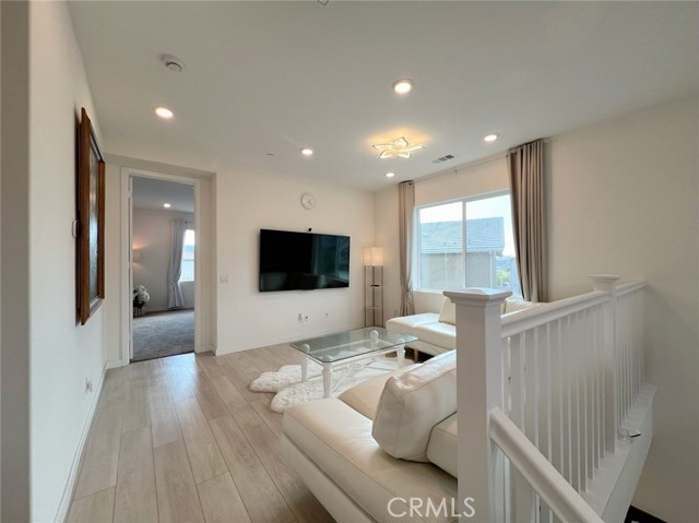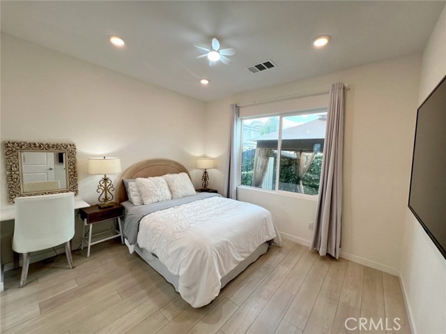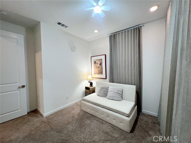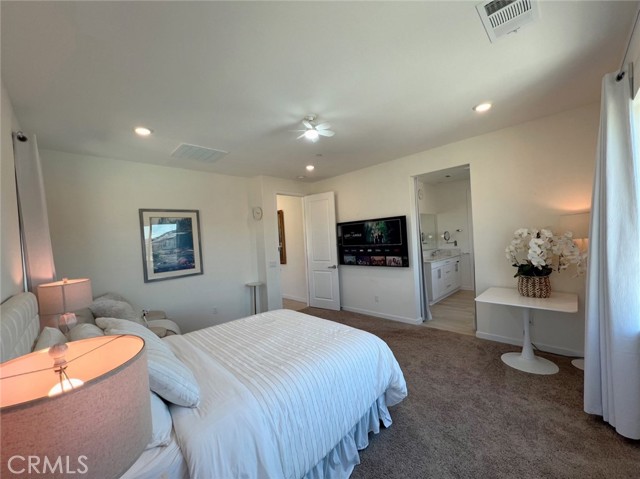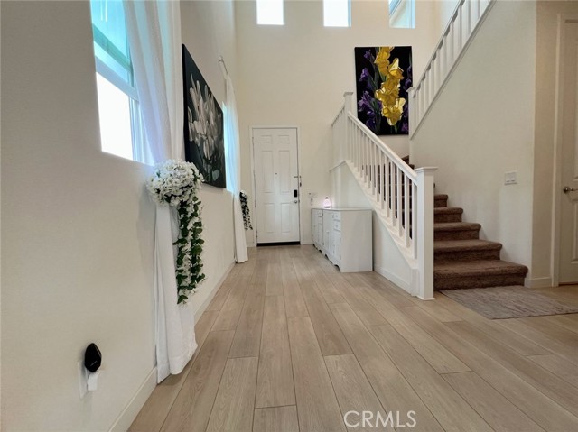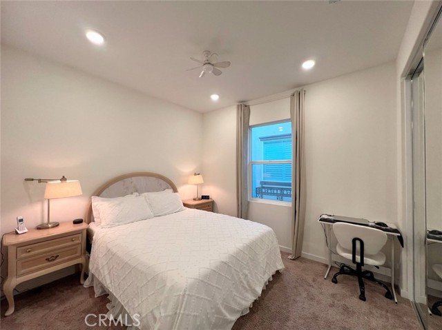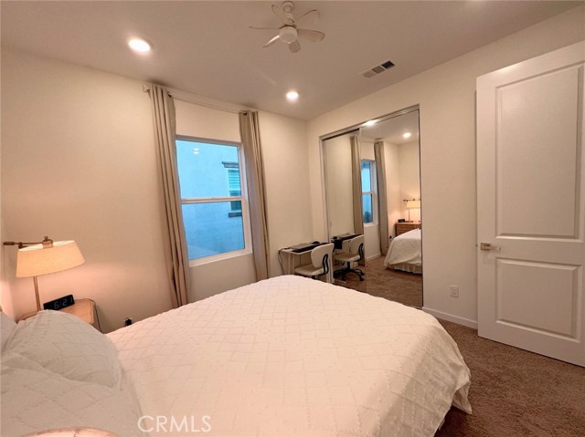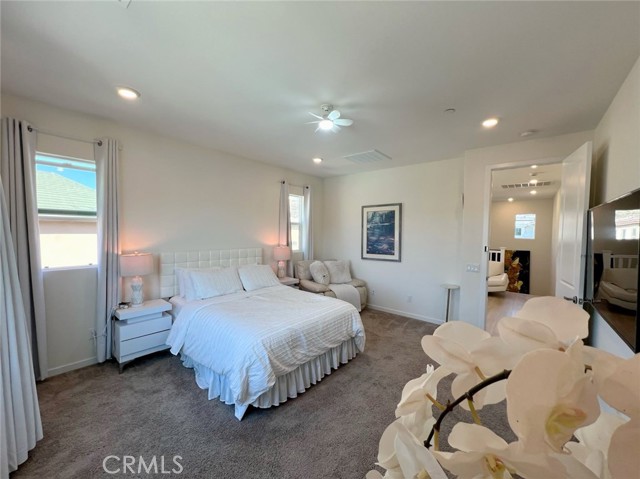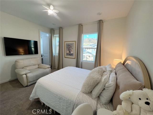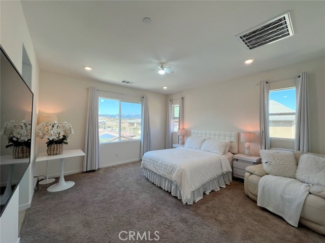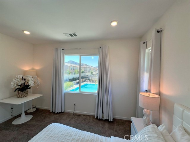 Welcome to your MOVE-IN READY dream home (with FULLY FURNISHED OPTION) in the highly sought-after Trenton Heights community! This beautifully upgraded 5-bedroom, 3-bath ENERGY STAR® efficient residence blends modern comforts with stunning mountain views. Upstairs, you'll find four spacious bedrooms and two baths, while the downstairs offers a private bedroom and full bath — perfect for guests, complete with an upgraded sliding door for added privacy. Step inside and enjoy the open-concept floor plan with soaring 9-foot ceilings, wood/laminate flooring, and contemporary lighting throughout. The gourmet kitchen features complete appliances, an alkaline water system installed, a separate pantry, and upgraded countertops. The serene primary suite is your personal retreat, overlooking mountain scenery and the relaxing clubhouse pool. It boasts a generous walk-in closet, dual vanities, upgraded tile finishes, a spa-like soaking tub, and a separate glass-enclosed shower. Additional highlights include: • Dedicated upstairs laundry room with washer and dryer included • Linen storage area for added convenience • Smart home features, including a cutting-edge smart AC system with dual control and EV charging readiness -All bathrooms are equipped with smart electronic bidets, heated toilet seats with a dryer function. - 12-panel solar system installed - upgraded insulation - a spacious 2-car garage Step outside into your own private oasis with beautiful artificial turf landscaping, two patio gazebos, and a storage area. As a resident, you'll enjoy exclusive HOA amenities such as a sparkling community pool, stylish party room, indoor/outdoor showers, and more — all just steps away from your premium lot. Plus, with easy access to both the 14 and 15 freeways, commuting is a breeze. Don't miss this rare opportunity — this is the home you've been waiting for.