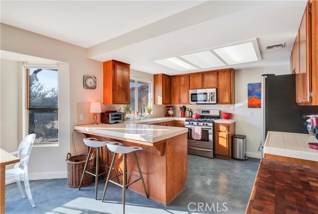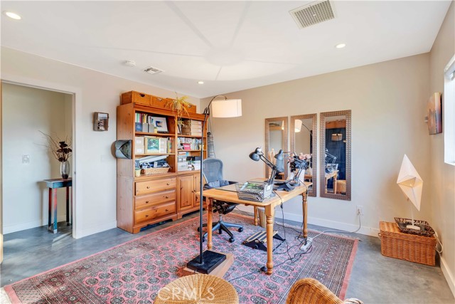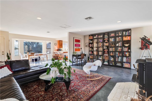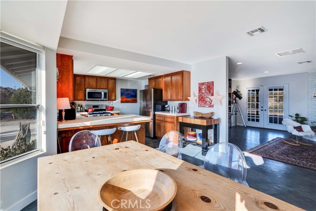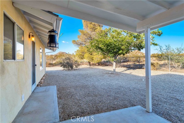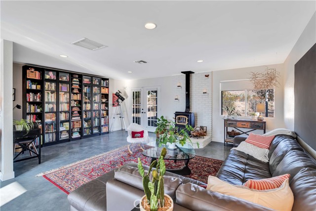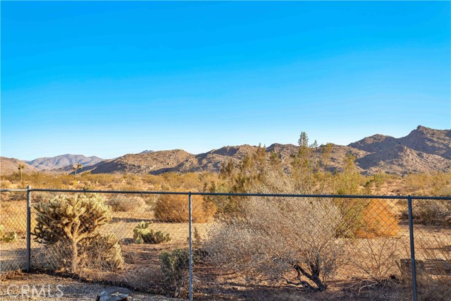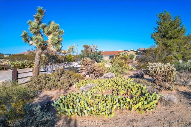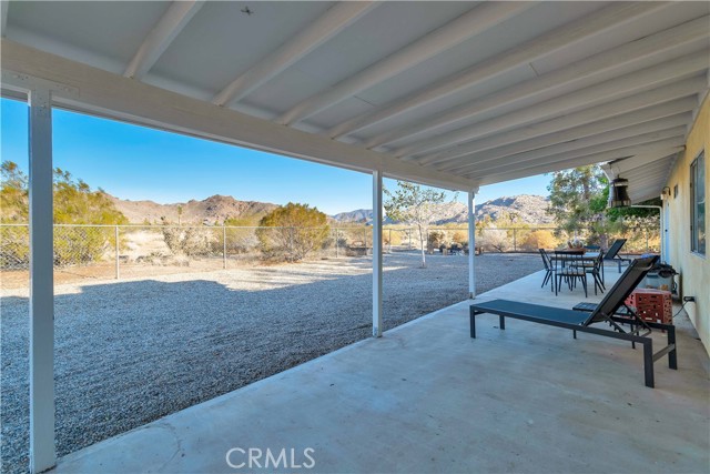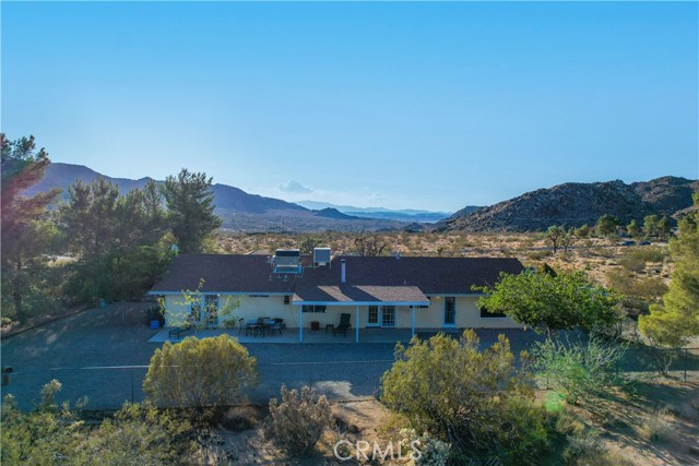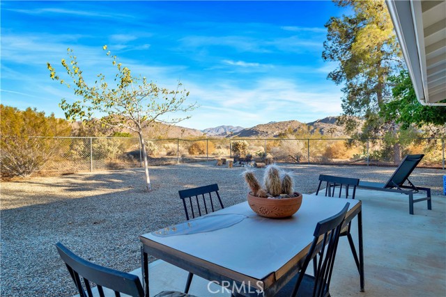 Live your best life in this spacious showplace on 2.5 acres with breathtaking 360 degree mountain views in the coveted Monument Manor neighborhood. Near the west entrance to Joshua Tree National Park, this 1,840 sq. foot 3 bedroom, 2 bathroom, pine shaded oasis offers comfortable and stylish living in a stunning natural environment. An entertainer's delight, this home boasts a generous open floor plan. The chef's kitchen -- featuring stainless steel appliances and a breakfast bar -- opens into a roomy dining nook and vast, inviting living area with a cozy wood burning stove and French doors that open onto the expansive covered patio. The bedrooms are sizable and the bonus room with a private entrance presents space for a yoga room, office, or studio. Among this gem's many charms are gorgeous coated concrete floors, recessed lighting, and ample windows that bathe the space in natural light. Beyond its beauty, this home is very well-suited for practical living, with central HVAC and ducted Mastercool, dedicated laundry area, and 2 car attached garage. Wake to the sound of chattering quail as dawn pinks the horizon and enjoy coffee on the patio. Take a hike in nearby Joshua Tree National Park, and later, enjoy stargazing while listening to coyotes sing. Truly the best deal in the best area. Don't miss this one -- come see today!