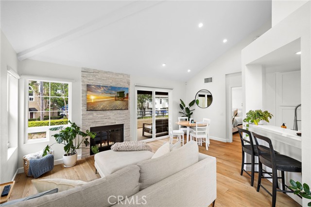 Completely reimagined, this one-bedroom plus loft residence in the Expressions at Rancho Niguel community blends modern upgrades with coastal ease. Thoughtfully remodeled from top to bottom, the home is defined by light-filled interiors, soaring ceilings, and a seamless sense of style. The living room centers around a stone-accented fireplace, framed by double-pane sliding doors that extend to a private deck finished with new waterproofing and lighting — an ideal retreat for morning coffee or evening gatherings. The adjoining dining area flows into a newly renovated kitchen featuring quartz counters, custom cabinetry with soft-close drawers, a tile backsplash, stainless steel sink, and Bosch and GE stainless-steel appliances. The primary suite offers direct access to the deck, a spa-inspired bath with new tub, shower tile, vanity, LED mirrors, and custom closet cabinetry. Upstairs, the spacious loft doubles as a guest retreat or home office, complete with its own remodeled powder bath. Every detail has been renewed: luxury vinyl plank flooring, recessed LED lighting with dimmers, energy-efficient dual-pane windows, and fresh neutral paint throughout. The garage has been transformed with epoxy flooring, custom cabinetry, overhead storage, and panel walls for optimal organization. Additional enhancements include upgraded laundry cabinetry, new plumbing and fixtures throughout, and custom light-filtering shades. Residents enjoy access to the community pool and spa, while the location places you minutes from Laguna Niguel Lake, Whole Foods, and the vibrant coastal lifestyle of Laguna Beach and Dana Point. With thoughtful design and an unbeatable setting, this home offers the best of comfort and convenience in the heart of South Orange County.